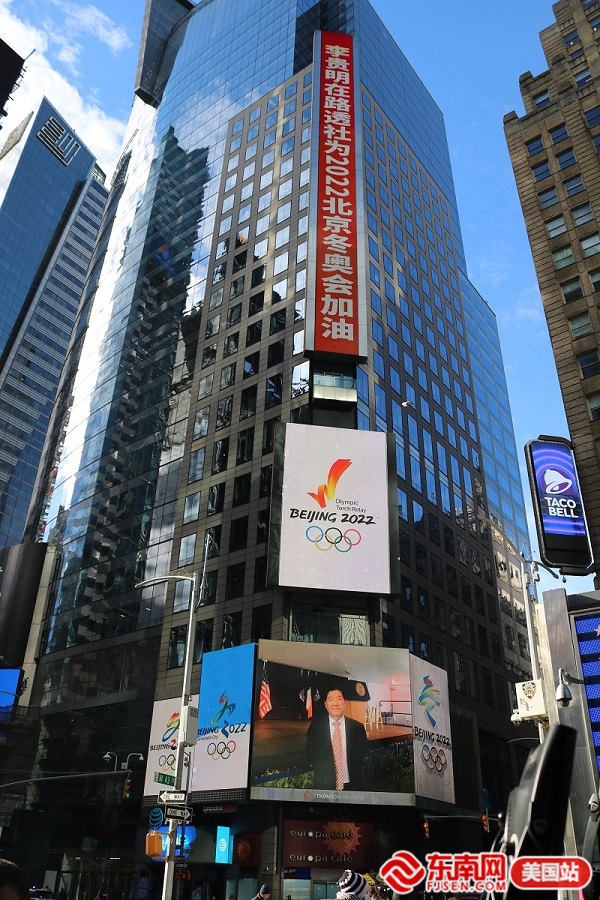東南網(wǎng)美國12月4日訊(本網(wǎng)特約記者 白水 文/圖)美國當(dāng)?shù)貢r間12月3日12時18分,美國福建聯(lián)合總會榮譽主席李貴明在美國紐約時代廣場路透社大屏幕打出“為2022北京冬奧會加油”口號。 “傳播新時代中國故事、北京故事,為北京喝彩,為中國加油!向全世界展現(xiàn)海外中華兒女對北京冬奧運的喜悅心情和民族精神。是我們海外赤子的最大心愿!”李貴明說,在全球最大的屏幕為北京冬奧會加油,將會讓國際社會更加關(guān)注中國,關(guān)注北京,使北京驚艷世界,成為影響世界的未來之城、科技之都。