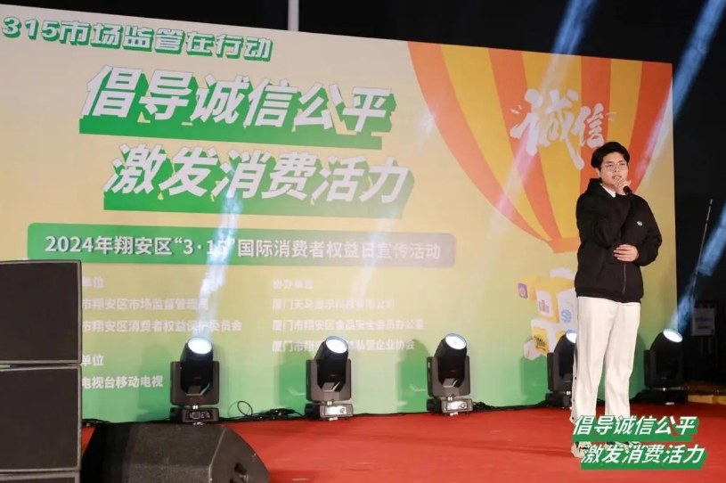 翔安區(qū)市場(chǎng)監(jiān)管局黨組書記、局長(zhǎng)許子翼上臺(tái)致辭,宣布2024年翔安區(qū)“3·15”國(guó)際消費(fèi)者權(quán)益日宣傳活動(dòng)正式啟動(dòng)。