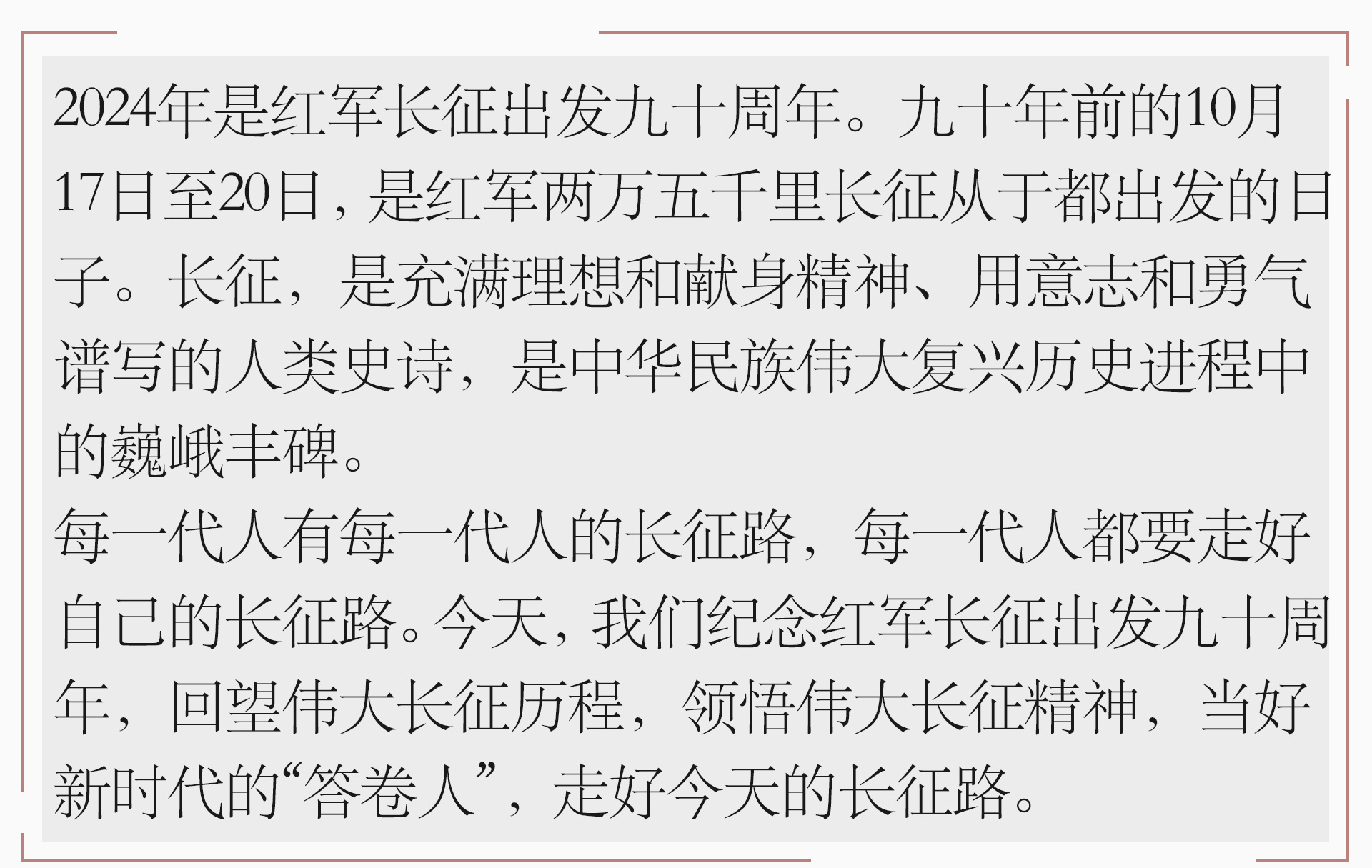 長(zhǎng)征勝利啟示我們:人民群眾有著無(wú)盡的智慧和力量,只有始終相信人民,緊緊依靠人民,充分調(diào)動(dòng)廣大人民的積極性、主動(dòng)性、創(chuàng)造性,才能凝聚起眾志成城的磅礴之力。