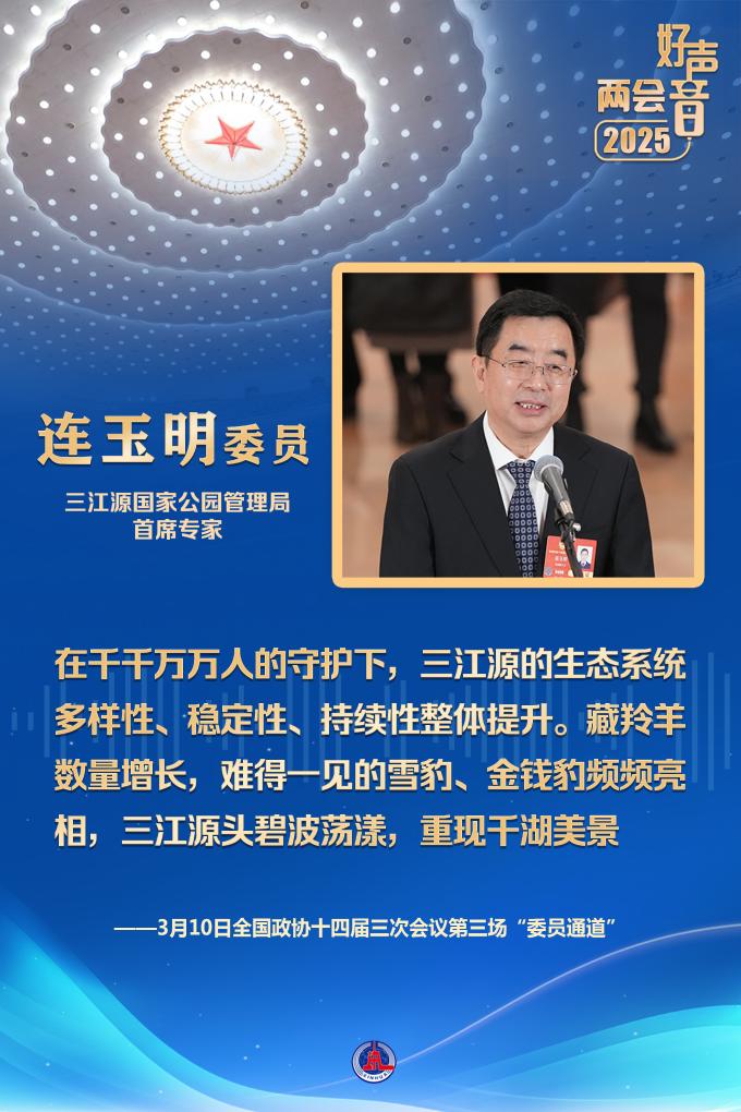 第一位回答記者提問的三江源國(guó)家公園管理局首席專家連玉明委員,是一名援青干部。他告訴大家,在三江源國(guó)家公園,有21432名生態(tài)管護(hù)員。在千千萬(wàn)萬(wàn)人的守護(hù)下,三江源的生態(tài)系統(tǒng)多樣性、穩(wěn)定性、持續(xù)性整體提升。藏羚羊數(shù)量增長(zhǎng),難得一見的雪豹、金錢豹頻頻亮相,三江源頭碧波蕩漾,重現(xiàn)千湖美景。