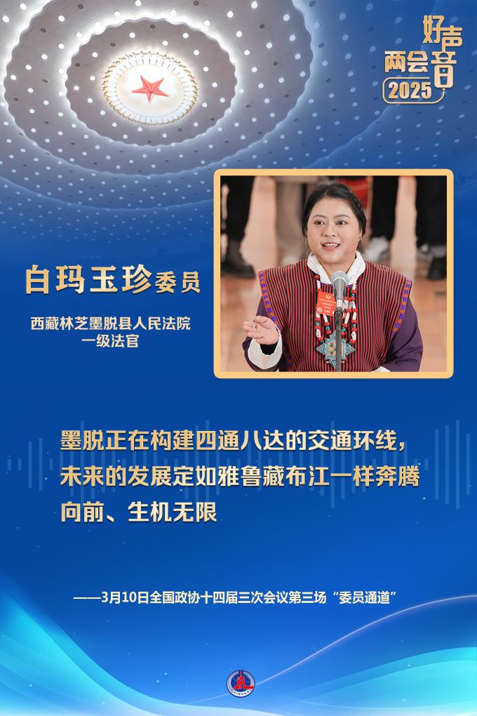 白瑪玉珍委員來(lái)自全國(guó)最后一個(gè)通公路的縣——西藏墨脫。她說(shuō),墨脫實(shí)現(xiàn)了從“高原孤島”向“美麗邊城”的時(shí)代蛻變,家家戶戶用上了干凈水、穩(wěn)定電、高速網(wǎng),老百姓吃上了“生態(tài)旅游飯”,增收的路子越來(lái)越寬。