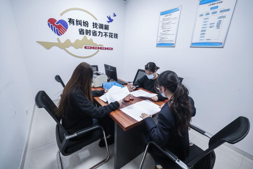 2025年2月25日,在浙江省嘉興市南湖區(qū)社會矛盾糾紛調(diào)處化解中心,調(diào)解員(右一)在調(diào)解金融借款合同糾紛。新華社記者 徐昱 攝