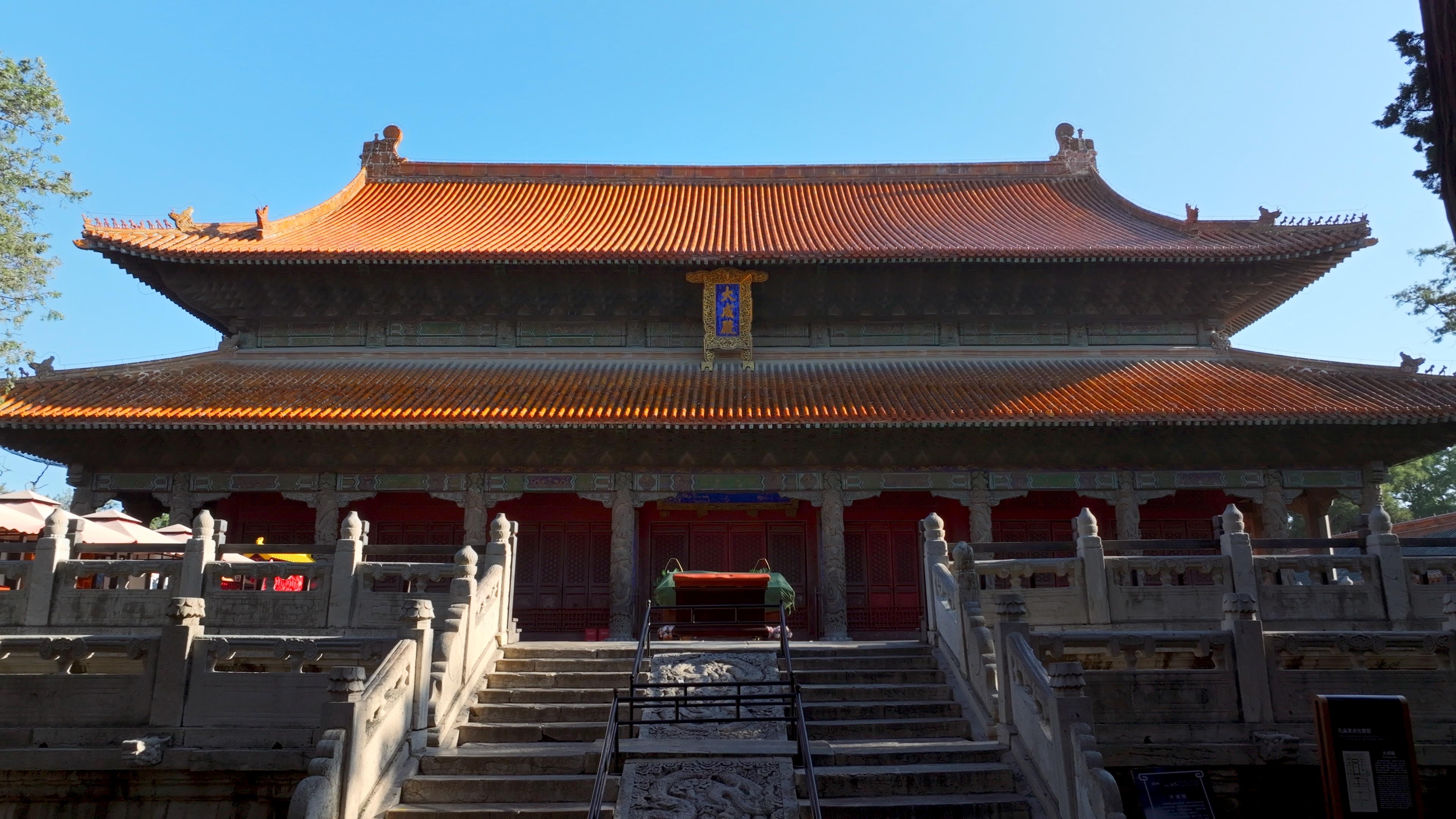 △十三碑亭修建年代分布 十三座碑亭 恰如歷史的十三方印章 銘刻著古代帝王來(lái)此參拜的盛況 大成殿 在十三碑亭背后 終于迎來(lái)整個(gè)建筑群的高潮 它是孔廟的核心建筑 ——大成殿