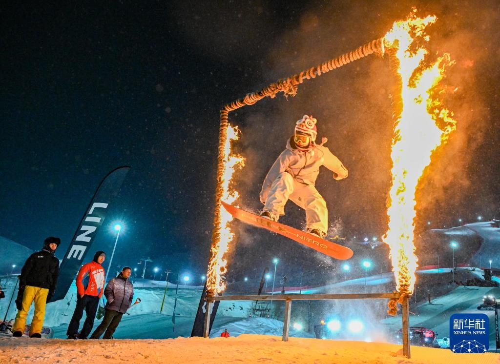 2025年1月29日,在坐落于阿勒泰市城區(qū)的新疆將軍山國(guó)際滑雪度假區(qū),雪友在新春趣味滑雪公園跳臺(tái)活動(dòng)中鉆過火圈。新華社記者陳朔攝