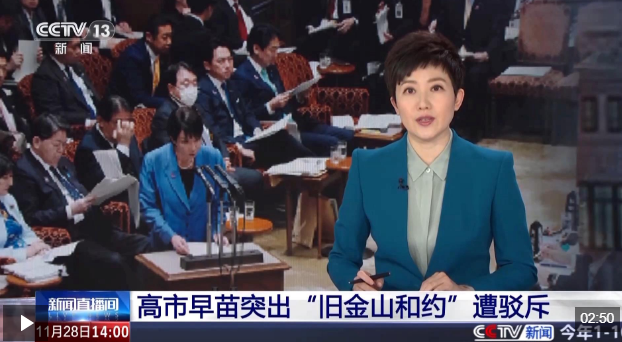 特約評論員 蘇曉暉:“舊金山和約”之所以非法無效是因為此前《開羅宣言》《波茨坦公告》以及《日本投降條款》等確認了中國對臺灣的主權(quán)。同時,“舊金山和約”的簽署也違反了《聯(lián)合國家宣言》的規(guī)定,也就是說“舊金山和約”不應(yīng)該也不能夠背著中國處置中國的領(lǐng)土。而近日日本首相高市早苗再次談及“舊金山和約”,試圖凸顯這個“和約”,其實是再次對中日關(guān)系政治基礎(chǔ)進行了沖擊。中日之間達成的四個重要的文件是中日關(guān)系的政治基礎(chǔ),日本非常清楚在一個中國原則上,自己作出的重要的承諾和四個政治文件對于臺灣問題的明確規(guī)定,而此時高市絕口不提四個政治文件,不愿意重申四個政治文件當(dāng)中的關(guān)鍵內(nèi)容,反而再提“舊金山和約”,這樣的做法,既是對戰(zhàn)后規(guī)則的沖擊,也是對中日之間達成重要共識的再次違背。所以,高市本人的做法是錯上加錯。