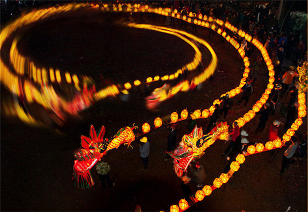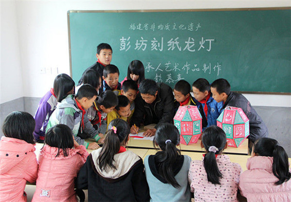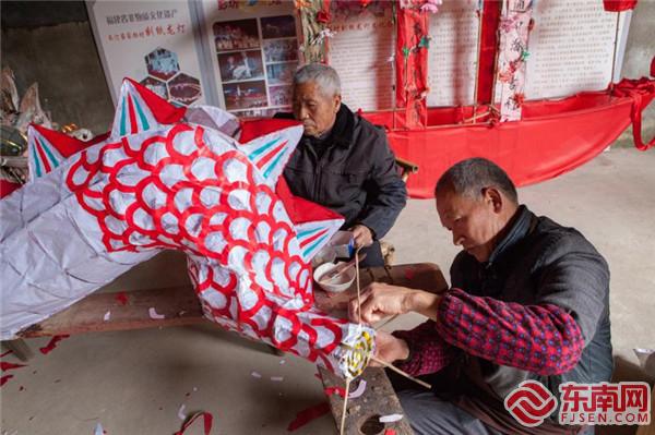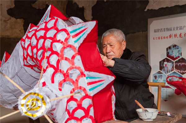 老藝人在制作刻紙龍燈 胡曉鋼 攝 歲末年初,長汀縣童坊鎮(zhèn)彭坊村處處透著一股濃濃的喜慶。一大早,張延玉和彭慕財(cái)、彭慕喜三位老人便拎著鑿具箱來到彭氏宗祠,與村委委員們一起籌劃正月刻紙龍燈比賽,舞龍、游龍等事宜。 祠堂正廳,68歲的張延玉抬手掀開塑料袋,三對巨大的紙制龍頭和龍尾依舊活靈活現(xiàn),栩栩如生。張延玉仔細(xì)打量這些由他親手制作的作品?!斑@些龍頭、龍尾都是純手工制作,前后做下來需要一個月的時間,”張延玉十幾歲開始跟著叔公學(xué)藝,跟這門技藝打了大半輩子交道,如今他是村里為數(shù)不多能夠制作龍頭、龍尾的老藝人。 一條完整的龍燈主要由龍頭、龍身、龍尾三大部分組成,整條龍的骨架用竹蔑扎成,其中龍頭、龍尾表面采用扎、刻、鑿、剪、貼、裱工藝制成,而龍身燈籠上精美細(xì)膩的圖案花樣都采用“刻、鑿”的制作工藝。 “制作龍頭龍尾的工藝十分復(fù)雜,龍身裝裱用的紙也頗講究,”張延玉說,龍身須用純手工制作、有韌性、透光性強(qiáng)的連素紙,貼上各種圖案,再裝裱在橢圓形八面體的燈籠上,之后固定在屋桷子木板上,即形成龍身。各龍身與龍頭龍尾通過活動撐桿進(jìn)行接駁,便形成了一條五彩斑爛的刻紙龍燈。 所謂“刻紙龍燈”是用特制的數(shù)種尖刃斜口刻刀,將色紙墊在圓木上鑿刻出的“剪紙”,也稱“刻紙”。據(jù)傳,由清康熙年間彭氏第十五代祖先彭景周將泉州剪紙藝術(shù)、花燈藝術(shù)融入在當(dāng)?shù)氐凝垷羯希⒓右詣?chuàng)新組合,融合龍圖騰文化、刻(鑿)紙文化、花燈文化、客家文化等于一身的“刻紙龍燈”,距今已有三百多年歷史。 “舞龍是我們村正月十三到十五的保留節(jié)目,每到這時候村里可熱鬧了!”張廷玉說,每年元宵節(jié)前,家家戶戶都會動手刻紙、用竹篾扎制龍燈,晚上全村出動,有條不紊地將各家龍燈接駁在一起成為3條完整的龍燈,接駁過程稱為“駁燈”,寓意全村人相互團(tuán)結(jié)、凝聚成龍。 傳承之困,后繼乏人