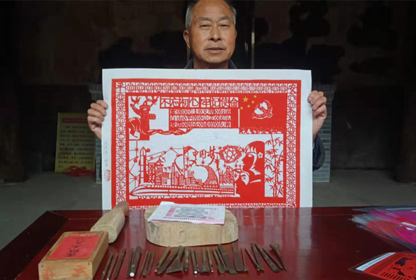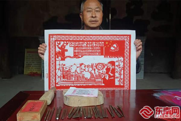 彭慕財(cái)老人在展示他的作品。東南網(wǎng)記者 賴志昌 攝 時代變遷,古老的技藝也在傳承中得以創(chuàng)新發(fā)展。翻開彭慕財(cái)老人的作品集,一張張《中國夢》《不忘初心、牢記使命》等題材的刻紙作品躍然紙上,格外引人注目?!斑@幅《中國夢》是我專門為慶祝新中國成立68周年而創(chuàng)作的,68個燈籠代表68周年,展現(xiàn)當(dāng)代我們幸福的美好生活?!碧崞疬@幅曾送展的作品,彭慕財(cái)頗為自豪。 除了表現(xiàn)傳統(tǒng)題材外,彭慕財(cái)、彭慕喜等老藝人還別出心裁地在刻紙龍燈圖案中加入社會主義核心價(jià)值觀、黨的十九大精神、鄉(xiāng)村振興戰(zhàn)略等新內(nèi)容,借助傳統(tǒng)文化傳播好政策、好思想。“藝術(shù)創(chuàng)作也要緊跟時代、貼近時代而創(chuàng)新,傳播當(dāng)代新思想、新風(fēng)尚!”彭慕財(cái)說。