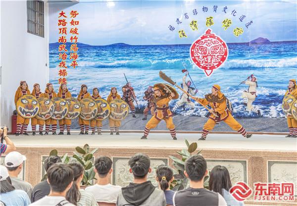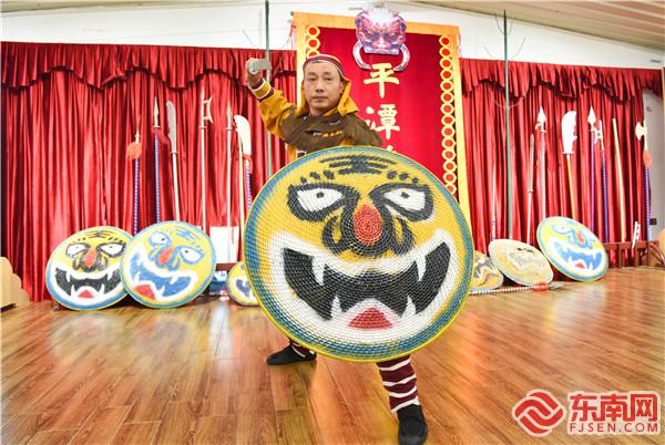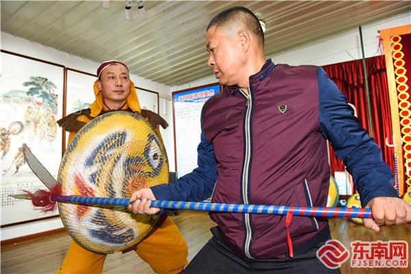 陳文英正在練習(xí)藤牌操 東南網(wǎng)記者 張哲昊 攝 走進(jìn)平潭藤牌操傳承基地三樓陳列室,記者一下就被墻邊整齊擺放著的長(zhǎng)槍、短刀、鹿角叉等兵器,以及造型各異的虎頭藤牌所吸引。 要靈活運(yùn)用這些兵器與藤牌陣法并非易事。陳文英告訴記者,藤牌操訓(xùn)練強(qiáng)度之大,讓不少學(xué)員望而卻步?!拔疫@一批師兄弟,大部分人就是倒在了‘鴛鴦步’這招上?!彼f,許多人扛不住,新鮮勁兒一過就紛紛退出了。 陳文英口中的“鴛鴦步”,正是藤牌操的精髓所在。這種步法以腿上功夫見長(zhǎng),要求練習(xí)者蹲下身子,降低身體重心,雙手?jǐn)[好架勢(shì),兩腿交叉快速前進(jìn),對(duì)體能要求極高。 現(xiàn)場(chǎng),陳文英為記者演示了一遍“鴛鴦步”,只見他不僅步伐扎實(shí)穩(wěn)健,還能一邊舉起武器與藤牌比劃,一邊與旁人交流,大氣不喘一口?!叭裟軌蛴么苏行袆?dòng)自如,才能進(jìn)而學(xué)習(xí)陣法?!彼f。 這并非一朝一夕之功。為了練好藤牌操,陳文英白天在外務(wù)工,晚上才一頭扎進(jìn)由石板條搭建的簡(jiǎn)易訓(xùn)練場(chǎng)練操,時(shí)常一練就是一整夜,直到將“蹲跳滾爬”四項(xiàng)基礎(chǔ)功夫完全掌握,方才出師,這花了他3年多的時(shí)間。 在他看來,學(xué)藤牌操門檻不算高,最要緊的是需勤練不輟。之后,陳文英逐漸成長(zhǎng)為藤牌操傳人中的中流砥柱,常利用空閑時(shí)間義授藤牌操,在當(dāng)?shù)匾逊e累了一定名氣,一年到頭要承接十?dāng)?shù)場(chǎng)演出。 可事與愿違,平潭藤牌操由盛再度轉(zhuǎn)衰,幾乎就是轉(zhuǎn)眼的事。 上世紀(jì)90年代末以來,藤牌操的觀眾逐年減少,老師傅相繼離世,其它藤牌手大多涌向外地謀生,而年輕一代卻不愿意接班。 更令人擔(dān)憂的是,藤牌操保留下的正宗套路僅余三分之一!若不加以保護(hù),很有可能會(huì)上演“人亡藝絕”的悲劇,這讓陳文英的心里火急火燎。 “藤牌操是老祖宗留下的遺產(chǎn),一定要守護(hù)好!”陳文英謹(jǐn)記師父的囑托,迫不及待地行動(dòng)起來,開始了傳承藤牌操的“保衛(wèi)戰(zhàn)”。 傳承:破除舊規(guī),煥發(fā)新活力