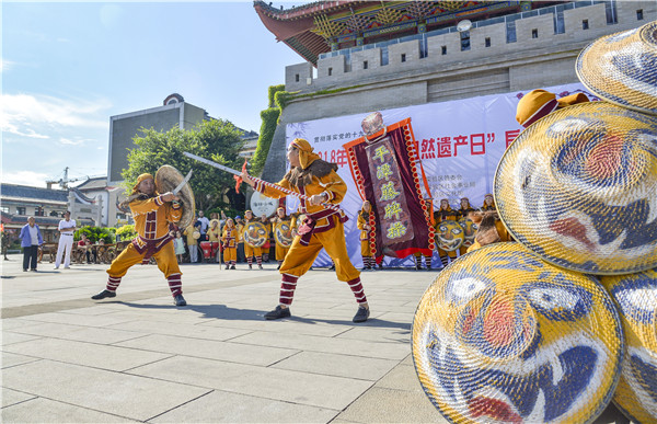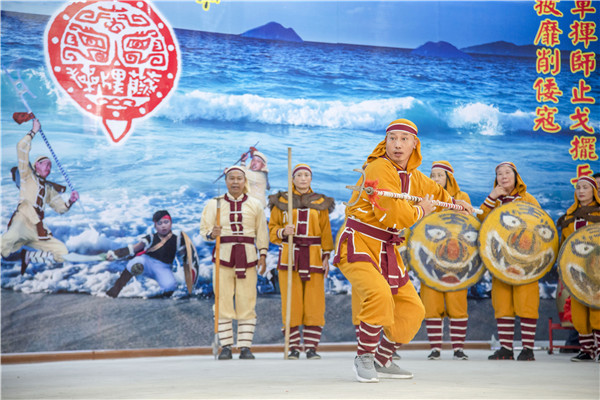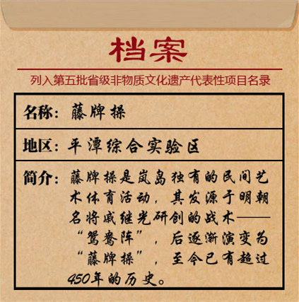 藤牌操表演 江信恒 攝 平潭藤牌操又稱“藤牌舞”,發(fā)源于明嘉靖年間,由抗倭名將戚繼光所創(chuàng)的戰(zhàn)陣戰(zhàn)術(shù)“鴛鴦陣”演變而來,即讓兵勇手執(zhí)藤制盾牌,配長(zhǎng)短兵器,在陣法之中跳躍滾動(dòng),前進(jìn)殺敵。 據(jù)史載,明清以來,平潭一直是海防重地。戚家軍入駐平潭后,發(fā)動(dòng)當(dāng)?shù)乇虏倬殹傍x鴦陣”,抵御倭寇,該陣式因此在平潭日益普及,經(jīng)過歷代改良,慢慢演變?yōu)椤疤倥撇佟薄?/p> 民國(guó)初年,平潭因積貧積弱導(dǎo)致疾病盛行,民眾遂將藤牌操視作健身活動(dòng),大練藤牌操,以驅(qū)邪降癘,強(qiáng)身健體。藤牌操迎來了“黃金時(shí)代”,一度風(fēng)靡嵐島。 后來,當(dāng)?shù)刂鋷熽愬\和將藤牌操與技擊、體操、舞蹈等相融合,形成了一字長(zhǎng)蛇、二龍戲珠、三才定穴等十個(gè)陣法,以及太公獨(dú)釣、仙人指路、觀音坐蓮等三十六套招式,這才確立了沿襲至今的表演“范式”。藤牌操也逐漸成為民間文娛活動(dòng)中的“藤牌舞”。