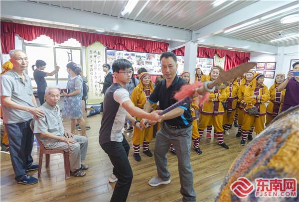 陳文英(左)與師兄張緯榮練習(xí)藤牌操 東南網(wǎng)記者 張哲昊 攝 今年55歲的陳文英正是陳錦和的曾孫,他說,自己家中世代傳承藤牌操,祖父陳阿命過去常在家中教導(dǎo)伯父陳輝生練習(xí)藤牌操,二人都是當(dāng)?shù)仨懏?dāng)當(dāng)?shù)奶倥撇偈?,他耳濡目染,?duì)藤牌操產(chǎn)生了濃厚興趣。 可惜的是,“文革”期間,藤牌操所用兵器均被收繳,這項(xiàng)流傳了數(shù)百年的民間藝術(shù)逐漸消匿于田間地頭,傳承一度式微。直到上世紀(jì)80年代初,第三、四代傳人們一口氣招收了26名弟子,才慢慢恢復(fù)元?dú)?,又重出“江湖”,重獲生機(jī)。 陳文英就是這批弟子其中之一。18歲起,他便師從伯父陳輝生,成為了平潭藤牌操第五代傳人。 陳文英回憶,每逢宗族祭祀、佳節(jié)慶典等場(chǎng)合,藤牌操一定是必備表演項(xiàng)目,圍觀群眾眾多,可以說是“萬(wàn)人空巷”。 在表演過程中,藤牌操手身著仿古武士裝,右手持兵器,左手拿虎頭藤牌,與“對(duì)手”“短兵相接”,隨著音樂輾轉(zhuǎn)騰挪,一時(shí)間刀光劍影,觀賞性極佳。“身邊許多朋友看完后,也會(huì)在閑暇時(shí)模仿起來,慕名前去拜師學(xué)藝的年輕人更是絡(luò)繹不絕?!标愇挠⒒貞浾f。 尚武之風(fēng)再度興起。在這樣的氛圍下,陳文英開始了學(xué)藝之路,這一堅(jiān)持,就是大半輩子。 學(xué)藝:苦練絕活,走上傳承路