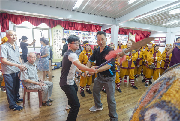 陳文英正在指導(dǎo)臺(tái)灣青年練習(xí)藤牌操。 江信恒 攝 由于藤牌操的武術(shù)特性,其傳人一度以男性為主,他們大多是家中頂梁柱。一直以來,藤牌操演出都是以“純義務(wù)、零收費(fèi)”的模式進(jìn)行,難以糊口,如何生存?這成了限制藤牌操發(fā)展的桎梏。 轉(zhuǎn)機(jī)出現(xiàn)在2012年初,央視《新春中國(guó)行》節(jié)目組來到平潭,全程直播了藤牌操表演,向海內(nèi)外觀眾展示這一民俗瑰寶,藤牌操一時(shí)名聲大噪。 此后,商演的機(jī)會(huì)如雨后春筍般涌現(xiàn),藤牌操手也有了收入保證。同時(shí),當(dāng)?shù)卣闹匾暢潭扰c扶持力度不斷加大,通過將藤牌操與海島旅游、兩岸文化交流相結(jié)合,衍生出了許多活動(dòng),收獲了來自海峽兩岸民眾的青睞。“演出場(chǎng)次與昔年相比,翻了一番?!标愇挠⒄f。 2012年底,平潭藤牌操協(xié)會(huì)應(yīng)運(yùn)而生,陳文英任副會(huì)長(zhǎng)、教練員。他聯(lián)合其他傳承人對(duì)藤牌操表演形式、伴奏音樂、服裝道具等進(jìn)行革新,讓表演更加流暢、緊湊,不斷提高藝術(shù)表現(xiàn)力?!霸谠谢A(chǔ)上,我們創(chuàng)編了易學(xué)易練的藤牌武術(shù)操、藤牌健身操,降低入門門檻,吸引更多人加入?!彼f。 如何才能走出傳人青黃不接的困境?平潭藤牌操協(xié)會(huì)破除“傳內(nèi)不傳外,傳男不傳女”的舊規(guī)矩,將傳承觸角延伸至當(dāng)?shù)伛v軍、中小學(xué)校,并開始吸納“娘子軍”,為藤牌操注入源源不斷的“新生血液”。 洪芳便是首批拜在陳文英門下的女弟子之一,如今耍起藤牌操已經(jīng)有板有眼?!耙宦犝f開始招收女學(xué)員,我便趕著去報(bào)名了?!焙榉夹χf,“剛開始,我?guī)缀趺客矶简v出2小時(shí),在陳教練的指導(dǎo)下訓(xùn)練,原本只是抱著強(qiáng)健體魄的目標(biāo)堅(jiān)持下來,現(xiàn)在我也能指導(dǎo)師弟妹練習(xí)了?!?/p>