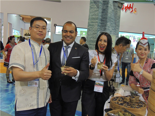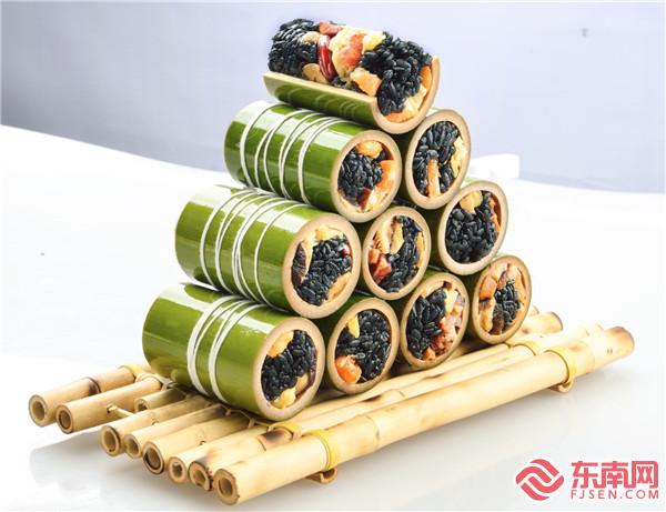 竹筒飯烏米飯。受訪者供圖 除了研發(fā)與傳統(tǒng)節(jié)日相關(guān)的烏米粽,他們還生產(chǎn)各種口味的手抓烏米飯、五米漢堡、竹筒飯等多種新品,受到越來越多食客的青睞。 “把傳統(tǒng)技藝與市場有效接軌,非遺才能真正‘活’起來,才能傳下去。”藍(lán)進(jìn)良認(rèn)為,烏米飯要傳播的更遠(yuǎn)就要從自身出發(fā),將傳統(tǒng)畬族文化元素和現(xiàn)代元素相結(jié)合,順應(yīng)市場變化,最大限度地滿足各類消費(fèi)者的不同需求。 作為一名畬族人,藍(lán)進(jìn)良擔(dān)負(fù)起帶著烏飯“走出去”的使命。近年來,藍(lán)進(jìn)良通過參加各種旅游節(jié)、美食節(jié)、文博會、農(nóng)產(chǎn)品推介會、“一村一品”展銷會等,讓畬族烏飯?jiān)谶@些舞臺上亮相展示,他帶去的烏飯也總是被搶購一空。