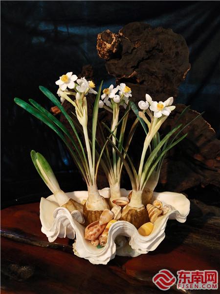 詹勝的作品《亭亭玉立》。受訪者供圖 事實上,技藝精湛的詹勝,是步入中年之后才開始正式學習貝雕創(chuàng)作的。 2012年,詹勝、詹立新兩兄弟攜手姚仁貴、林鑾彬、曾光藝、陳登欽、李藝諸等一眾資深手藝人,注冊成立福建映像海壇文化創(chuàng)意有限公司,從事貝雕設(shè)計、經(jīng)營、修復(fù)等,全力打造貝雕傳承團隊。同一時間,詹勝拜師姚仁貴,學習貝雕技藝,從此便“一發(fā)不可收”。 剛?cè)腴T時,他幾乎每天都在研究前輩的貝雕作品,直到將細枝末節(jié)都印刻在腦海里。他告訴記者,自己在接觸貝雕之前,曾長年從事雕刻技藝,因此上手很快,沒多久就開始自行設(shè)計創(chuàng)作。 漸漸地,詹勝的技藝純熟了起來,創(chuàng)作出了《鸚鳴喚友》《伴侶》等為人津津樂道的作品。他還在保留貝雕傳統(tǒng)特色的同時,形成了個人風格?!拔业淖髌凡⒉痪窒抻陲w禽走獸、山水草木等傳統(tǒng)樣式,而是注重植入在地文化符號,使作品更貼近生活?!彼f。