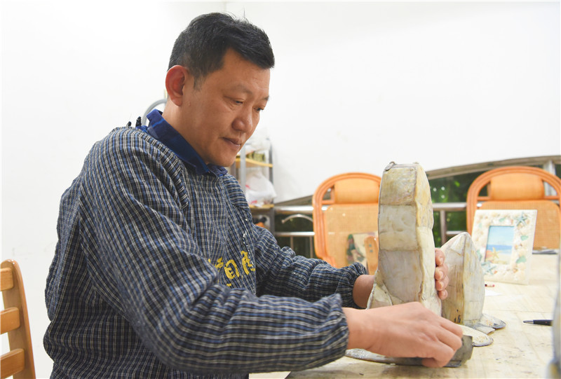 詹勝正在雕刻紅口螺。東南網(wǎng)記者 張哲昊攝 貝雕是最具平潭特色的民間工藝,至今已走過六十余載的歷史。 早在1955年,平潭就創(chuàng)辦了全國首家國營貝雕工藝廠,上世紀80年代進入鼎盛時期。據(jù)介紹,貝雕工藝廠那時有數(shù)百名員工,加上“家屬工”有上千人之多,其生產(chǎn)的貝雕造型別致、頗具韻味,深受消費者青睞,還曾出口美國、日本等多個國家和地區(qū)。 詹勝是土生土長的“平潭郎”,出生于1969年,家人大多從事文化藝術(shù)行業(yè)。他的表哥、表姐當時都在貝雕廠工作,常常把貝雕帶回家里加工賺“外快”。正是在這樣濃厚的氛圍之下,詹勝與貝雕結(jié)下了不解之緣,對這門手藝有著特殊的感情與回憶。 1987年,走出校門的詹勝選擇師從知名畫家,同時也是自己姐夫的許學明,進一步學習美術(shù)。隨后,他當起了個體戶,先后涉及家具、裝修、廣告等行業(yè),從事裝飾畫、木雕、玻璃畫雕刻等藝術(shù)創(chuàng)作。 時間來到上世紀90年代初,由于時代變化、國企改制、市場消弭等因素,平潭貝雕工藝廠倒閉,存留的貝雕藝術(shù)品大多散落在民間,名噪一時的平潭貝雕產(chǎn)業(yè)逐漸沉寂?!柏惖袼囆g(shù)是平潭文化的根與魂,是數(shù)代人的美好回憶,其價值不可估量,若是‘弄丟’了,被后人遺忘,這將是一大損失!”詹勝痛心疾首地說。 彼時,詹勝與哥哥詹立新交流起了“搶救貝雕”的想法,二人一拍即合,共同走上了非遺傳承之路。 說干就干。他們開始四處收集流失民間的貝雕作品,近20年來前后搜羅了數(shù)千件貝雕,并置于工作室中,儼然是一個貝雕博物館。他們還開設(shè)了貝雕專營店,販賣精致的貝殼工藝品。 盡管貝雕專營店生意平平,卻在當時引起了不少人的關(guān)注?!邦櫩蛡兌嗍瞧教侗镜厝?,他們來參觀、選貨的時候會告訴我,貝雕終于又重現(xiàn)江湖了,這讓我感到很欣慰?!闭矂僬f。 中年學藝,終圓“貝雕夢”