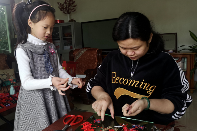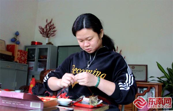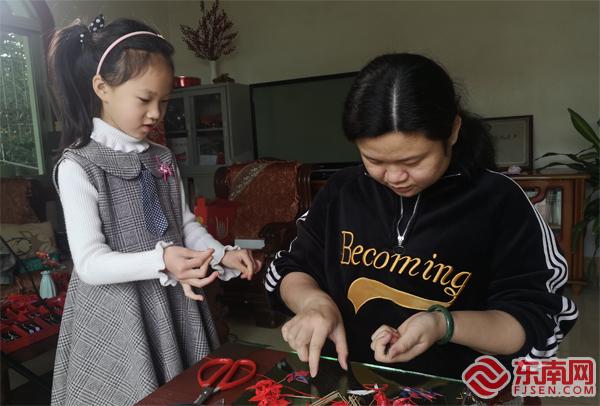 洪曉瑜8歲的女兒學(xué)習(xí)春仔花。 東南網(wǎng)記者 鄒玒攝 洪曉瑜和洪厝大多數(shù)姑娘們一樣,很小的時候就開始接觸春仔花了。7歲時,她便和外婆一起學(xué)做春仔花,8歲就賺到自己的“第一桶金”,一共2元錢。 春仔花在洪厝是一種融入生活的習(xí)俗。閩南人一生中三件大事—結(jié)婚、生子、起大厝(蓋房)都離不開它,白事也常用它做答謝親友的贈禮,因此先前,村民們會在農(nóng)閑時制作春仔花貼補家用。 如今,在茶余飯后,親友們圍桌“話仙”,即使斟滿了茶,手里依然忙著扎花,既是閑情,也是樂趣。洪曉瑜的母親洪素珍前幾年因眼疾漸漸看不清東西,手卻依然能熟稔地折出花來,絲線纏繞,簡單樣式的花不到一分鐘就在她手中誕生了。 洪厝的不少人家有一張桌子,放著紅線、染成紅色或金色的卡紙以及鐵絲,簡簡單單的工作臺,就能源源不斷地產(chǎn)出春仔花。如今,洪素珍一天要在桌前坐上十個鐘頭,她眼睛不好,但技藝在,做一些簡單式樣的春仔花,五百對一箱地裝好,有客戶需要就可以隨時取用。洪曉瑜則更多編一些花樣繁復(fù)的春仔花,編起來更為辛苦,但這已成為多年的習(xí)慣了,她笑稱“算是一種胎教”。 洪曉瑜的微信名字叫“守藝人”,她希望將春仔花代代相傳,結(jié)出碩果。如今,她8歲的女兒也在學(xué)習(xí)春仔花,她和其他傳承人更是將春仔花帶到了校園?!斑@是屬于閩南文化的獨特記憶,開課的時候,我們第一堂課往往不教上手操作,而是讓孩子們了解這項習(xí)俗。”洪曉瑜說,她們在翔安中心小學(xué)、洪厝小學(xué)都開設(shè)了興趣課程,每周一節(jié)。此外,她們還與當(dāng)?shù)氐纳鐓^(qū)開辦春仔花培訓(xùn)班,不定期走進廈門大學(xué)、集美美術(shù)學(xué)院等各大高校,讓更多的人了解、體驗春仔花。 一段緣 帶動春仔花花開兩岸