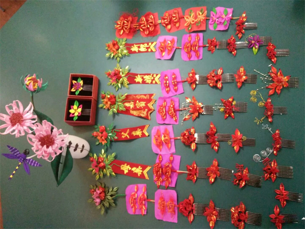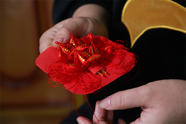 用于結(jié)婚的春仔花。 受訪者供圖 或許是手指纏繞鐵絲、絲線的手法變化神奇,或許是春仔花習(xí)俗給人以欣欣向榮的意味,洪厝的姑娘們做春仔花的手藝就這樣傳了出去。有嫁出去的女兒,就有春仔花的“開枝散葉”;嫁到村里的媳婦,在耳濡目染下,也開始喜歡這紅彤彤的“傳家寶”,學(xué)成后教給娘家的姐妹們。 經(jīng)過幾百年的傳承和發(fā)展,春仔花如今形成了婆婆花、新娘花、普通花、孩童花以及喪事花等十來個品種,每種花擁有不同的含義,在不同的場合供大家使用。 結(jié)婚,是春仔花“出席”最多的場合。新娘的媽媽精心選擇十二對(閏年十三對)春仔花,讓新娘帶到婆家。這其中就有婆婆花、新娘花、姑娘花、妯娌花等,每一對花的元素都有講究。
