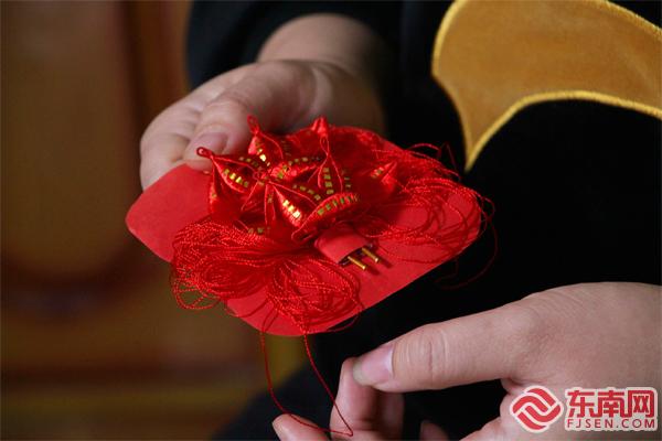 小小的“婆婆花”蘊含著許多吉祥的寓意。 東南網(wǎng)記者 鄒玒攝 “比如‘婆婆花’,正中間的石榴象征著多子多福,小葉子代表‘開枝散葉’,兩旁的‘面線須’代表老人福壽綿長,挖耳勺是‘婆婆花’必備的,表示媳婦娶進門,婆婆可以安心享福了。同時要注意的是,‘婆婆花’有前有后,‘前’在閩南話中有‘財’的意思,在普通話中與‘錢’諧音?!焙闀澡ふf,小小的一對花,需要講究的地方非常多,“新娘花”中的“雙石榴”元素也包含了早生貴子、一世幸福的美好寓意。“在我們這里,春仔花的品類非常多,無論紅事還是白事,都能見到它的身影”。 洪曉瑜的母親洪素珍四十多歲時,便開始為洪曉瑜準(zhǔn)備結(jié)婚用的春仔花了,在她看來,每一根線也代表著她對女兒的牽掛?!爸两裎疫€留著媽媽送我的春仔花。”洪曉瑜說。 一根線 串聯(lián)洪厝代代傳承