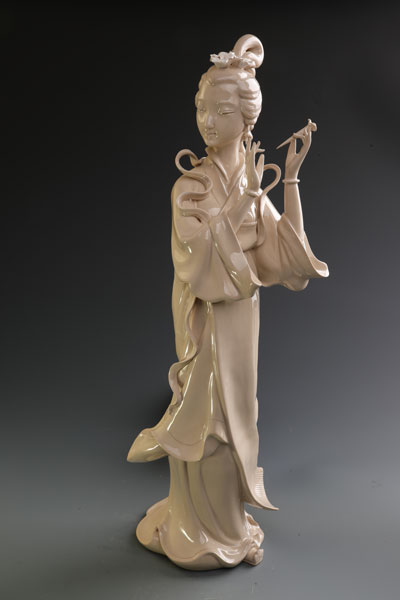 林俊結(jié)合漳州水仙花元素,燒制出東溪窯米黃釉“凌波仙子”像。 南靖縣博物館供圖 如今,盡管恢復(fù)了傳統(tǒng)技藝,如何傳承與發(fā)展遠(yuǎn)非易事?!耙獋鞒泻桶l(fā)展東溪窯傳統(tǒng)燒制技藝,關(guān)鍵是人。我們現(xiàn)在還有20多位師傅從事生產(chǎn)制作東溪窯瓷器,但由于整個過程為手工操作,聘請工匠比較難?!钡挚⌒判囊琅f,據(jù)介紹,近年來,在傳統(tǒng)技藝基礎(chǔ)上,他們嘗試著將漳州本土文化元素與東溪窯傳統(tǒng)燒制技藝相結(jié)合,生產(chǎn)出一批接地氣的新品,受到了市場的歡迎?!氨热?,我們用‘四菜一湯’‘凌波仙子’等漳州元素設(shè)計制作像形瓷器,吸引了年輕人的目光,也帶來了經(jīng)濟(jì)效益?!备G煙重燃,林俊希望東溪窯可以在市場上走得更遠(yuǎn)。