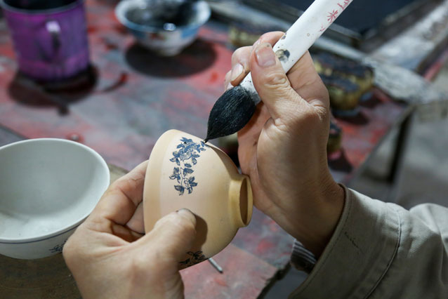 東溪窯瓷器彩繪尤為講究,紋飾有洞石花卉、纏枝菊花、山水、寒江獨釣等。 莊偉杰攝 除了堅持傳統(tǒng),東溪窯傳統(tǒng)燒制技藝的可貴之處還在于精益求精?!懊總€環(huán)節(jié)都要下足功夫,馬虎不得,若某個環(huán)節(jié)出錯,成品很可能開裂,就白費功夫了?!绷挚〗榻B,以上釉為例,坯體繪飾完成后,在表面涂上一層玻璃質(zhì)的釉藥是極為重要和較難掌握的一道工序?!耙龅皆煨椭懈鱾€部分的釉層均勻一致是件不容易的事。上釉前還需用手試釉,目測釉的濃稀是否適用?!痹诹挚】磥恚c其他瓷器燒制相比,東溪窯傳統(tǒng)燒制技藝最大的特色是,從最初的取材到最后的出窯,每一道工序都最大程度地堅持傳統(tǒng)并在同一條“生產(chǎn)線”完成,這在全國燒窯技藝中比較少見。 申遺路,見證窯煙重燃