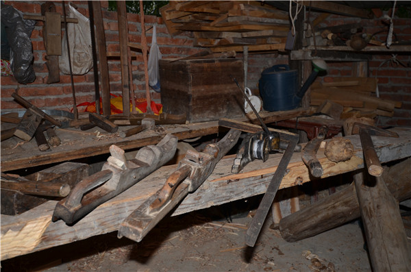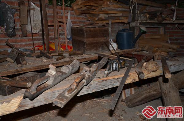鄭多雄與兒子鄭輝明在家中交流木拱廊橋建造技藝。東南網(wǎng)記者 陳翊群 攝 在父親的言傳身教影響下,如今鄭多雄的兒子鄭輝民也加入了木工匠人的隊伍。 “現(xiàn)在需要手工家具的很少嘍,不過跟著我的這些‘老家伙’們一直沒變?!痹卩嵍嘈鄣墓ぷ魇?,記者看到了老人口中陪伴他多年的“老家伙”:測繪用的魯班尺、墨斗、規(guī),切割用的斧頭、橘子、鑿子、鏟子,打磨用的刨子、鉆、銼……在散落的木屑間,它們被整齊地碼放著。