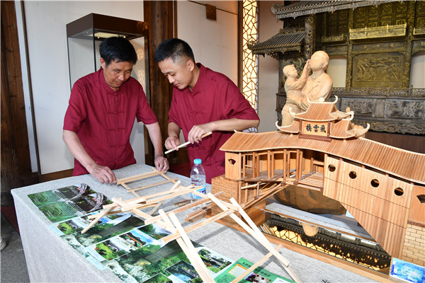 鄭多金(左)與弟弟鄭多雄在飛龍橋交流建橋經(jīng)驗。龔健 攝 鄭多雄原本主業(yè)是一名石匠,對造木拱廊橋一竅不通。跟鄭多金學造木拱廊橋也是機緣巧合。2002年,鄭多雄跟鄭多金學習遷建芹洋鄉(xiāng)張坑、長瀨溪兩座木拱廊橋回來后,他找來木工工具,每天花上八九個小時練習砍、劈、削、彈等基本功,熟記哥哥傳授的建橋工藝口訣。等基本功熟練后,他上山找來適合的木料,在哥哥的指導下搭建木拱廊橋模型。 在別人看來,完成這一系列工序?qū)嵲谑强菰餆o味,而鄭多雄卻持之以恒,樂此不疲。 “搭建一座木拱廊橋,需要建橋臺、測水平、立水柱架、支天門車、造拱架、上剪刀苗、橋板苗與馬腿、架橋屋等,每道工序缺一不可。剛開始每天花八九個小時制作。我印象最深的是,第一次建木拱廊橋模型,建了20來天仍然不成功。我堅持到了一個月后才建好第一個木拱廊橋模型。為了熟練掌握技巧,我后來又多次修建了不同尺寸的模型?!编嵍嘈刍貞浀?,經(jīng)過數(shù)年的打磨鍛煉,他的木拱廊橋營造技藝也漸漸小有名氣。 “大家生活水平也慢慢提高了,來找我做木工的人也絡繹不絕?!编嵍嘈壅f,不管是修繕老木屋還是節(jié)慶所用的木質(zhì)道具,很多人找他做。 “大家對我的手藝還比較滿意?!编嵍嘈蹣沸牢康卣f,靠著一直以來堅守的這門傳統(tǒng)手藝,他蓋起了全家人遮風避雨的小樓,生兒育女。 數(shù)十年建橋保持初心與匠心 其實,從建造石橋到木拱廊橋,這一路走來,鄭多雄從少年走到了花甲之齡,近到鄉(xiāng)里鄰居,遠到閩浙交接縣市區(qū),都有他的足跡。 “每個人的內(nèi)心都像一塊木頭,想變點兒樣子,須得先用斧頭砍一砍,再用錐子鑿一鑿,然后用刨子刨個光,最后用砂紙打光滑?!编嵍嘈壅f,徐、鄭世家祖?zhèn)髦髂葮蛟煸勚两褚呀?jīng)第八代,“我們既然做,就有義務有責任把它做好,做出名氣,一代代傳承下去?!?/p>