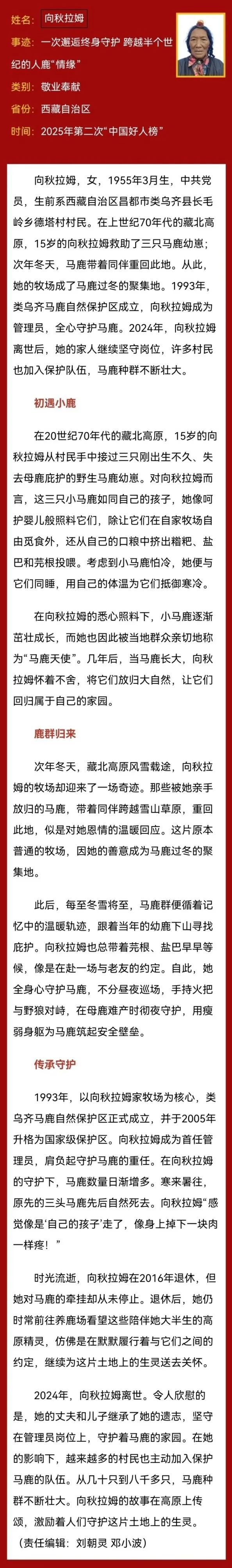 8月27日,2025年第二次“中國好人榜”發(fā)布儀式暨全國道德模范與身邊好人現場交流活動在黑龍江省伊春市舉辦。經各地推薦、網友評議和專家評審等環(huán)節(jié),“一次邂逅終身守護,跨越半個世紀的人鹿‘情緣’”的昌都市類烏齊縣向秋拉姆光榮上榜! 向秋拉姆沒有驚天動地的壯舉,卻在日復一日的躬身力行中,讓善意如春水浸潤人心。她質樸而堅韌的身影,讓文明溫暖三江大地,讓向上向善的力量涌動不息。 讓我們一起學習身邊好人 傳遞榜樣力量