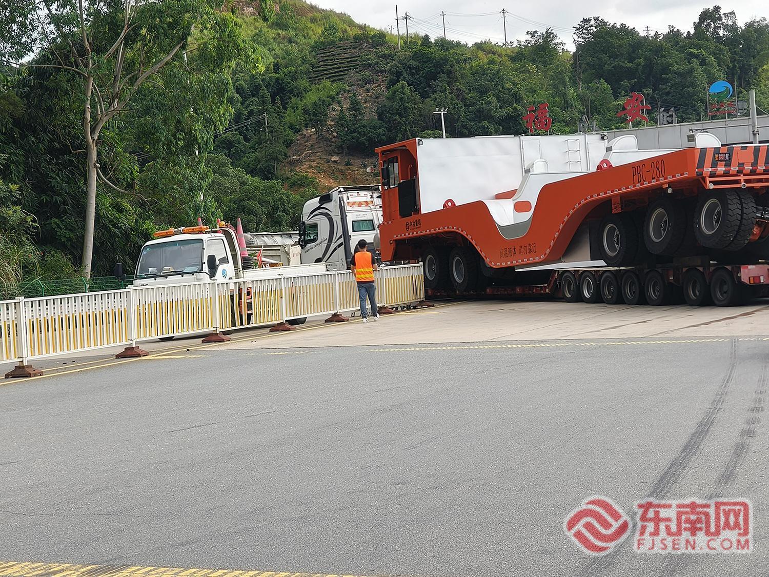 超限運輸車輛通過灣塢收費站。寧德高速執(zhí)法支隊供圖 為盡快打通通行通道,執(zhí)法人員立即與交警、高速養(yǎng)護等部門協(xié)商,制定應(yīng)急預(yù)案,最終決定引導(dǎo)車輛從入口車道反向駛出。隨后,各部門迅速進入“作戰(zhàn)狀態(tài)”,按照分工高效協(xié)作,拆除中央隔離帶、入口邊道光柵及防撞水泥墩,臨時開辟出一條通行通道,并全程引導(dǎo)、協(xié)助司機操控車輛。經(jīng)過兩個多小時的高效配合,這輛超限運輸車輛順利駛?cè)肴肟谑召M站內(nèi)廣場,并安全駛出灣塢收費站。