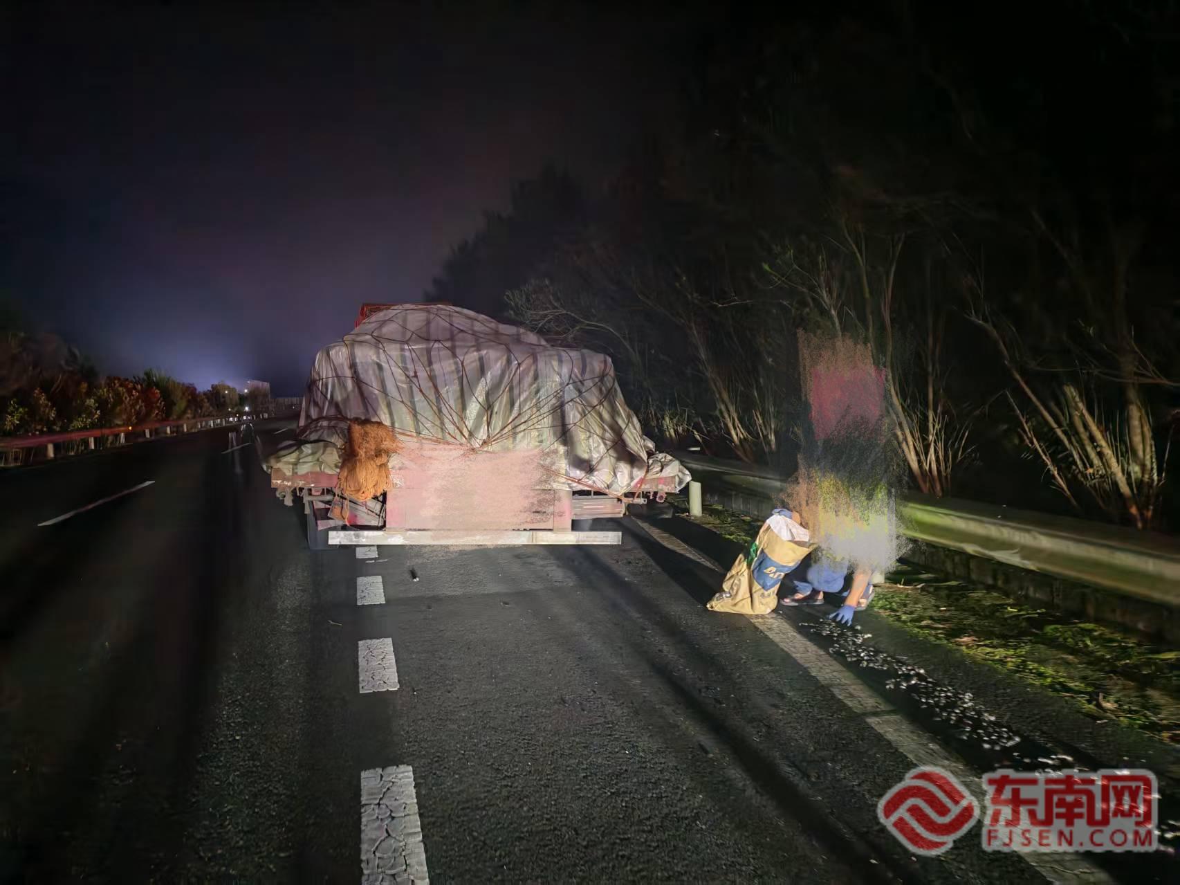 撒落現(xiàn)場。寧德高速執(zhí)法支隊供圖 待交通初步恢復通行后,針對十余輛爆胎滯留車輛,執(zhí)法隊員與交警組成護送隊,將還能夠行駛的車輛分批引導至附近服務區(qū),并主動協(xié)助車輛對接保險公司與就近維修廠,協(xié)助完成定損、換胎事宜。截至當晚19時許,受損車輛基本完成輪胎更換,經(jīng)安全檢查后逐輛駛離服務區(qū),繼續(xù)后續(xù)行程。 此次應急處置全程高效有序,未發(fā)生二次事故,寧德高速執(zhí)法、交警、路勤多部門的快速聯(lián)動、精準協(xié)作,不僅及時化解了雨夜險情,更以“執(zhí)法為民”的實際行動,最大限度減少了群眾出行損失,有力保障了高速公路通行安全與群眾出行順暢。 寧德高速執(zhí)法部門提醒:貨車駕駛員出車前,務必仔細檢查貨物捆綁加固情況,確保裝載牢固;若在高速上遇貨物掉落或突發(fā)險情,切勿盲目停車撿拾,需牢記“車靠邊、快警示、人撤離、即報警”原則,及時撥打12122求助,共同守護高速通行安全。 |