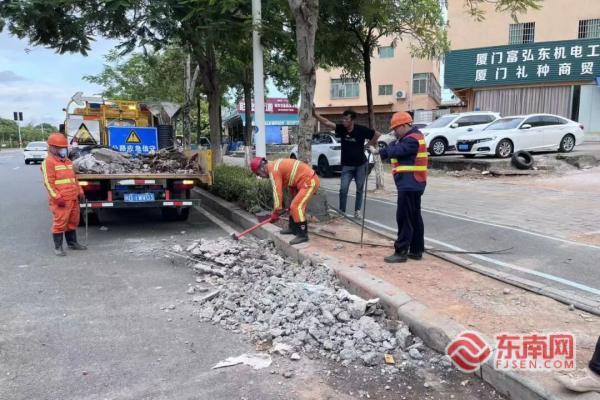 公路部門(mén)組織拆除(廈門(mén)公路供圖) 發(fā)現(xiàn)該情況后,翔安公路部門(mén)與區(qū)交通執(zhí)法大隊(duì)迅速啟動(dòng)聯(lián)動(dòng)執(zhí)法機(jī)制。工作人員現(xiàn)場(chǎng)勘查確認(rèn)了違規(guī)事實(shí),并依據(jù)《公路安全保護(hù)條例》等法律法規(guī),立即組織專(zhuān)業(yè)力量,調(diào)用施工機(jī)械對(duì)該處違規(guī)硬化的混凝土路面進(jìn)行徹底破除與清理,有效恢復(fù)道路原貌,及時(shí)消除了安全隱患。
