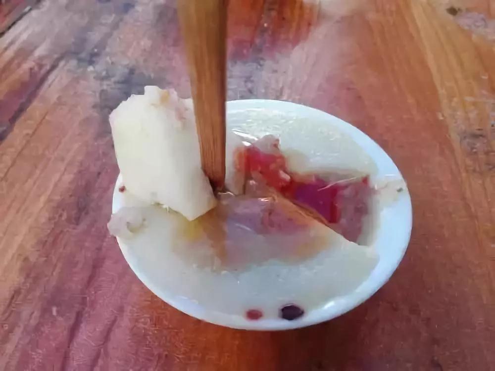 翔安最原始的做法是,地瓜先磨成粉,然后用大米熬粥拌上地瓜粉,放在石臼舂爛,使大米和地瓜粉揉合在一起,然后加水,調(diào)到適合稠度,放到鐵鍋里煎成一張張的薄皮,切成兩厘米左右的粉條,這就是地瓜粉粿。煮的時(shí)候,下足油,加上海蠣、小蝦等海味,撒上蔥花或芹菜,這樣湯頭就會(huì)濃、而且味道鮮美。