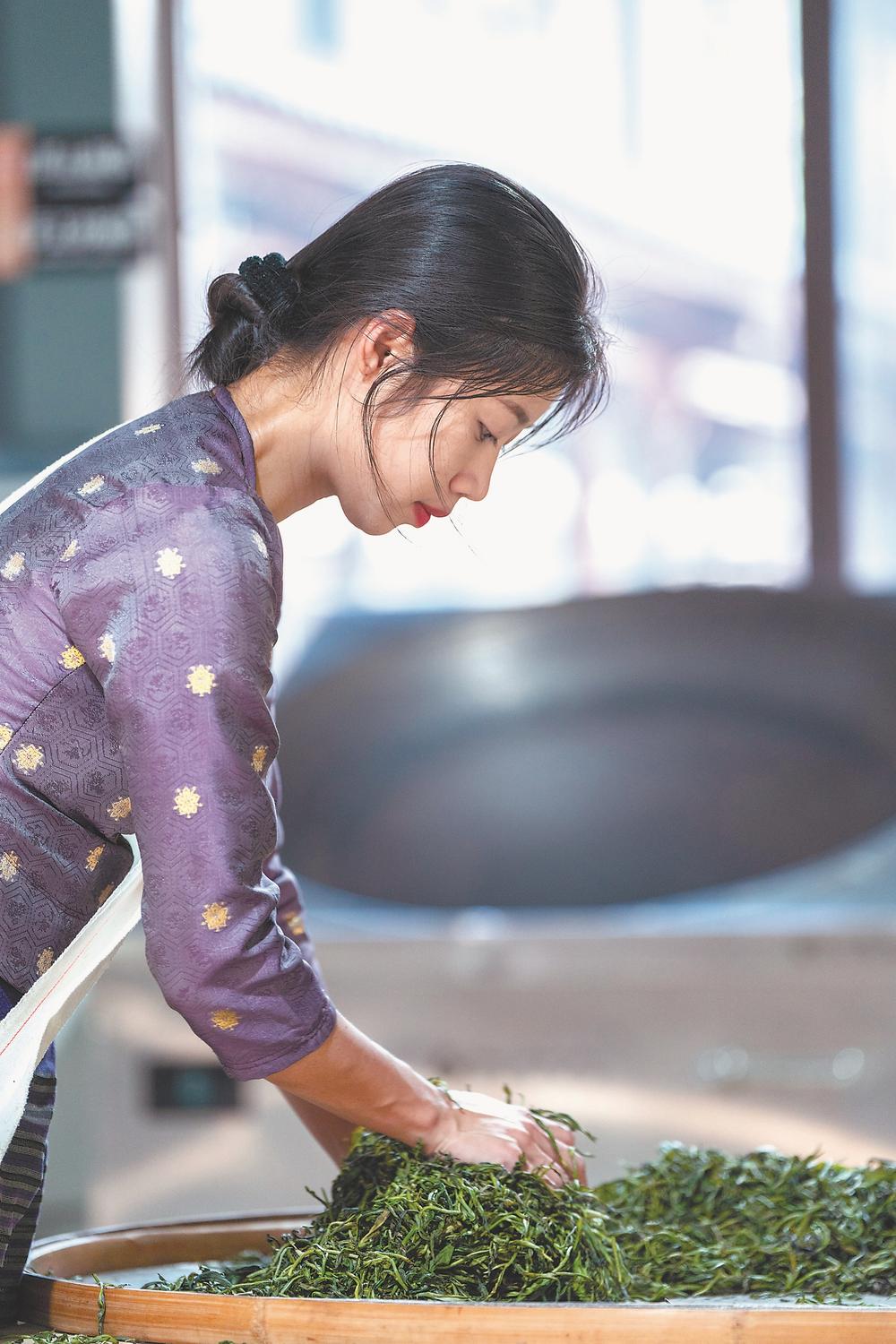 15日,在景邁山布朗公主茶廠,傣族姑娘葉香在給茶葉殺青。
