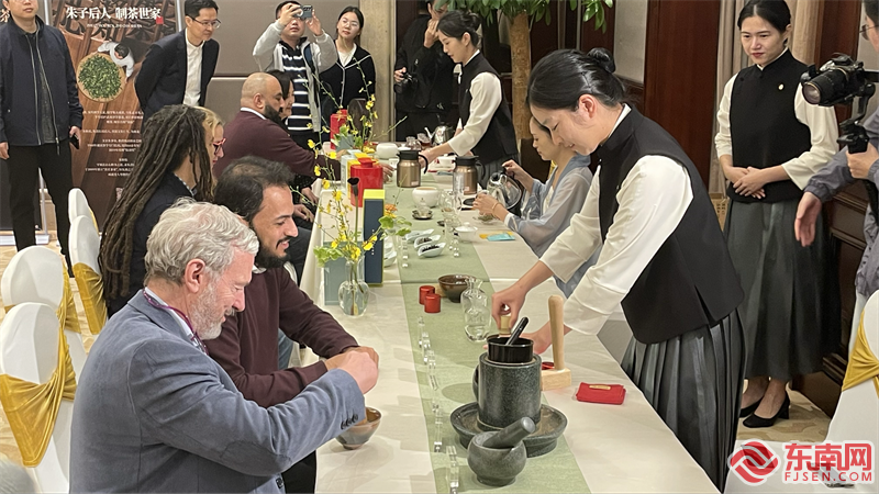 嘉賓體驗(yàn)點(diǎn)茶技藝。東南網(wǎng)記者 莊宇婧 攝 活動(dòng)現(xiàn)場,以一場別開生面的茶和天下活動(dòng)開啟,列入人類非物質(zhì)文化遺產(chǎn)代表作名錄的6類福建茶及多種福建非遺項(xiàng)目展示輪番上演。伴隨古琴曲《高山流水》,外交官一行圍站在臺前,觀看提線木偶泡茶表演。提線木偶表演藝術(shù)家通過一根根絲線,經(jīng)由雙手操控木偶,結(jié)合劇本背景、故事情節(jié),模擬人物不同的情態(tài),做出各式各樣、生動(dòng)形象的動(dòng)作,其中不乏提壺倒茶、揮毫?xí)鴮懙雀唠y度、有亮點(diǎn)的動(dòng)作。嘉賓們對精彩紛呈的非遺展演連連贊嘆,在互動(dòng)區(qū)域,嘉賓們還饒有興致地體驗(yàn)點(diǎn)茶、拓福等非遺項(xiàng)目。