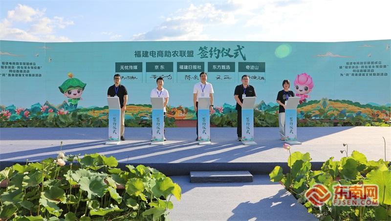 福建電商助農(nóng)聯(lián)盟成立暨“福農(nóng)優(yōu)品?我在家鄉(xiāng)等你來”網(wǎng)絡(luò)直播活動(dòng)正式啟動(dòng)。 東南網(wǎng)8月13日訊(本網(wǎng)記者 盧金福 傅心婕 肖曉敏 文/圖)為深入貫徹落實(shí)習(xí)近平總書記關(guān)于“三農(nóng)”工作的重要論述和對(duì)網(wǎng)信工作的重要指示精神,大力實(shí)施《數(shù)字鄉(xiāng)村發(fā)展戰(zhàn)略綱要》,進(jìn)一步推動(dòng)農(nóng)村電商高質(zhì)量發(fā)展,8月13日,福建電商助農(nóng)聯(lián)盟成立暨“福農(nóng)優(yōu)品?我在家鄉(xiāng)等你來”網(wǎng)絡(luò)直播活動(dòng)、為“荷”而來建蓮文化旅游活動(dòng)在三明市建寧縣啟動(dòng)?;顒?dòng)將開展系列數(shù)字強(qiáng)農(nóng)惠農(nóng)富農(nóng)專項(xiàng)行動(dòng),以福建電商助農(nóng)聯(lián)盟成立為契機(jī),網(wǎng)聚各方力量,帶熱“福農(nóng)優(yōu)品”。 省委副書記、福州市委書記郭寧寧出席活動(dòng)并講話,省委宣傳部副部長、省委網(wǎng)信辦主任、省互聯(lián)網(wǎng)信息辦公室主任申月,省委宣傳部副部長、福建日?qǐng)?bào)社黨組書記、社長陳輝宗,省農(nóng)業(yè)農(nóng)村廳黨組書記、廳長陳明旺,以及省委辦公廳、省文旅廳、省人社廳、省商務(wù)廳、省婦聯(lián)、省廣播影視集團(tuán)、省農(nóng)村信用社聯(lián)合社、興業(yè)銀行、中國銀行福建省分行、中國建設(shè)銀行福建省分行、三明市、建寧縣相關(guān)負(fù)責(zé)同志出席活動(dòng)。 活動(dòng)現(xiàn)場亮點(diǎn)紛呈,舉辦了福建電商助農(nóng)聯(lián)盟成立儀式。該聯(lián)盟由省委網(wǎng)信辦牽頭,聯(lián)合省農(nóng)業(yè)農(nóng)村廳、省文旅廳、省婦聯(lián)共同指導(dǎo),福建日?qǐng)?bào)社(東南網(wǎng))、福建農(nóng)林大學(xué)、興業(yè)銀行等10家單位發(fā)起,匯聚MCN機(jī)構(gòu)、供應(yīng)鏈企業(yè)、金融機(jī)構(gòu)等多方力量,依托福建省特色農(nóng)產(chǎn)品和文旅資源優(yōu)勢,構(gòu)建“政府引導(dǎo)+市場運(yùn)作+社會(huì)參與”的協(xié)同機(jī)制,借助數(shù)字技術(shù),形成數(shù)字鄉(xiāng)村強(qiáng)農(nóng)惠農(nóng)富農(nóng)、鄉(xiāng)村文旅深度融合、各類主體協(xié)同共建供應(yīng)鏈、文化產(chǎn)業(yè)賦能鄉(xiāng)村振興的立體化服務(wù)體系,推進(jìn)鄉(xiāng)村全面振興。