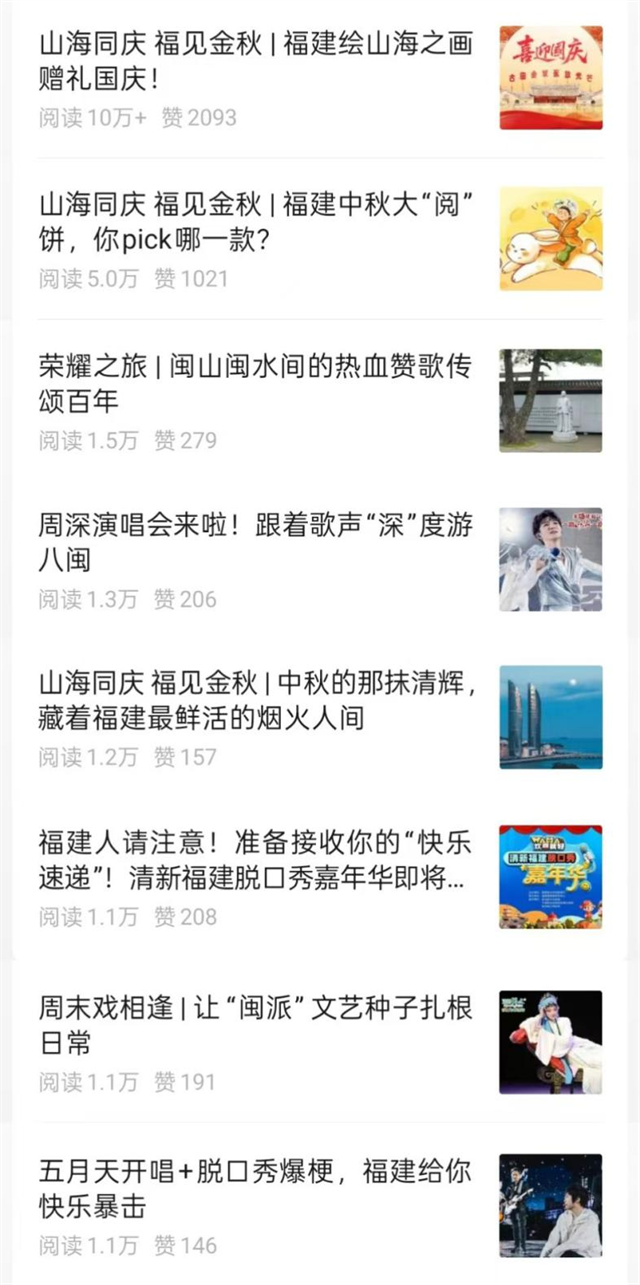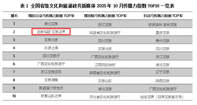 近日,文旅產業(yè)指數(shù)實驗室發(fā)布“全國省級文化和旅游政務新媒體2025年10月傳播力指數(shù)TOP10榜單”,福建省文化和旅游廳官方微信公眾號“清新福建文旅之聲”共發(fā)布推文121條,獲得總閱讀量75萬+次,轉發(fā)數(shù)3.3萬+。點贊總數(shù)和推薦總數(shù)全國最高,分別為10760次和5829次。憑借各項優(yōu)異的傳播數(shù)據(jù),“清新福建 文旅之聲”微信公眾號在TOP10榜單上排名全國第二名。