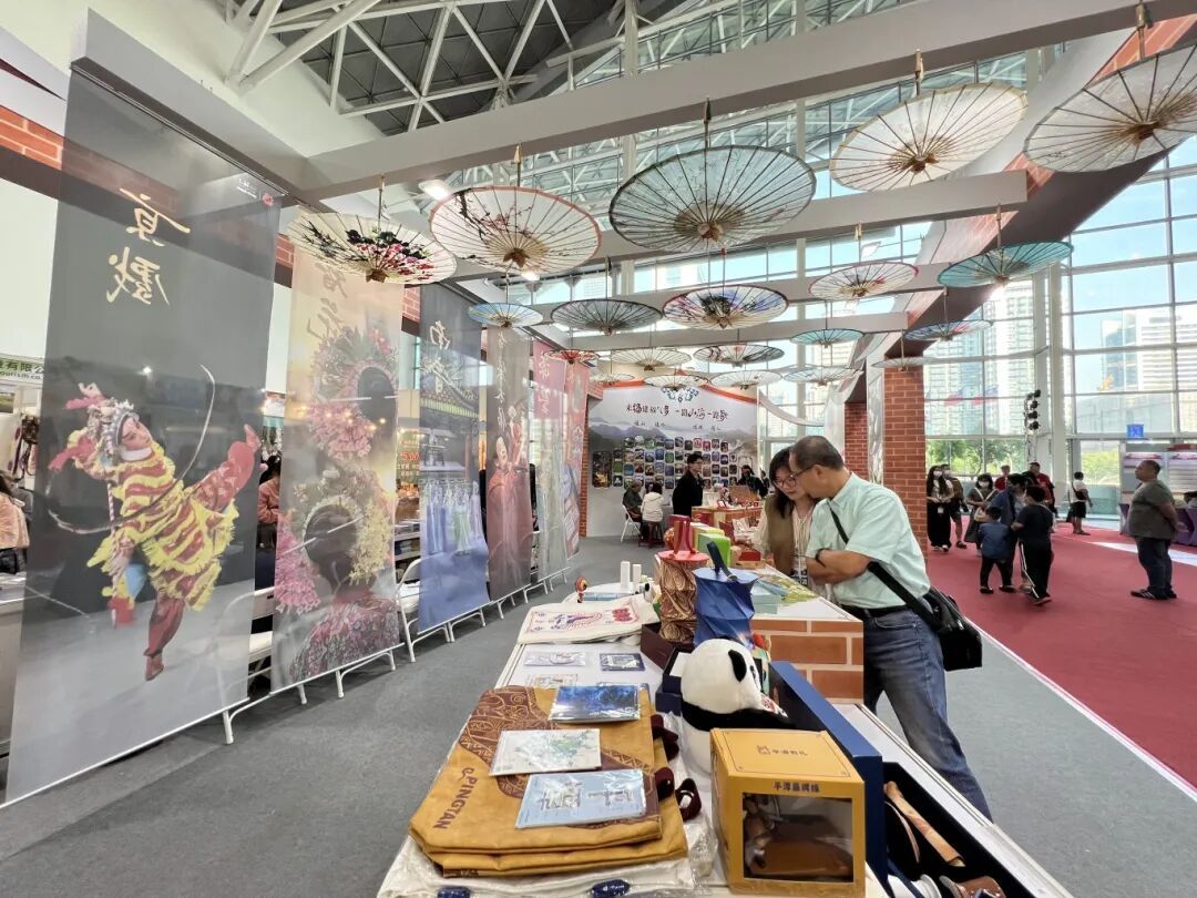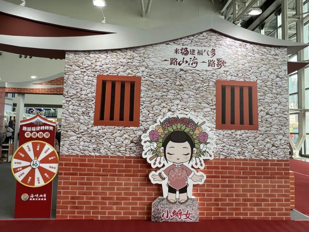 本次旅展,海旅會(huì)展區(qū)整體設(shè)計(jì)以閩南紅磚古厝元素為主,巧妙設(shè)置了泉州特色蟳埔蠔殼厝和小蟳女打卡區(qū),充滿著閩南濃濃鄉(xiāng)情味。莆田媽祖雕像和鼓浪嶼鄭成功雕像兩張巨幅圖像分立入口兩側(cè),六幅展現(xiàn)福建木板年畫、南音、漆藝、簪花、布袋木偶和京劇等非遺元素的紗縵圖,搭配空中朵朵盛開(kāi)的福州油紙傘,讓人眼前一亮。