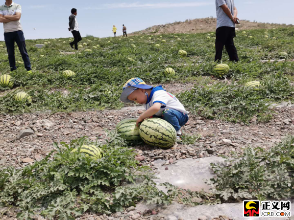 喊叫水鄉(xiāng)硒砂瓜成熟時節(jié),村民帶著孩子來田地里忙碌和查看。崔曉麗 攝 喊叫水村主要為黃土丘陵、河谷灘地,平均海拔在1500米,年均降水量僅250毫升左右,年蒸發(fā)量卻高達2000毫升,地下水和地表水均為苦咸水。雖然四季分明,但只能靠天收,種植小雜糧,根本談不上種植經(jīng)濟作物和發(fā)展種植產(chǎn)業(yè)?!斑@里最缺的是水,不缺的是窮?!焙敖兴宕逯魅涡l(wèi)平說,2005年村里的人均年收入只有500元。 窮則思變。2006年,中寧縣鄉(xiāng)兩級黨委、政府大力推行中衛(wèi)市“百萬畝硒砂瓜工程”,由政府牽頭、干部帶頭,幫助農(nóng)民種西瓜,協(xié)助農(nóng)民售西瓜,積極兌現(xiàn)種植補貼政策。“剛開始村民不理解為啥好好的土地要蓋上砂土種西瓜,我們就耐心入戶講解,讓農(nóng)民放心。”苗衛(wèi)平說,第一年種植硒砂瓜1000畝,產(chǎn)量100萬斤,全村硒砂瓜收入實現(xiàn)20萬元,人均可支配收入實現(xiàn)了翻番。