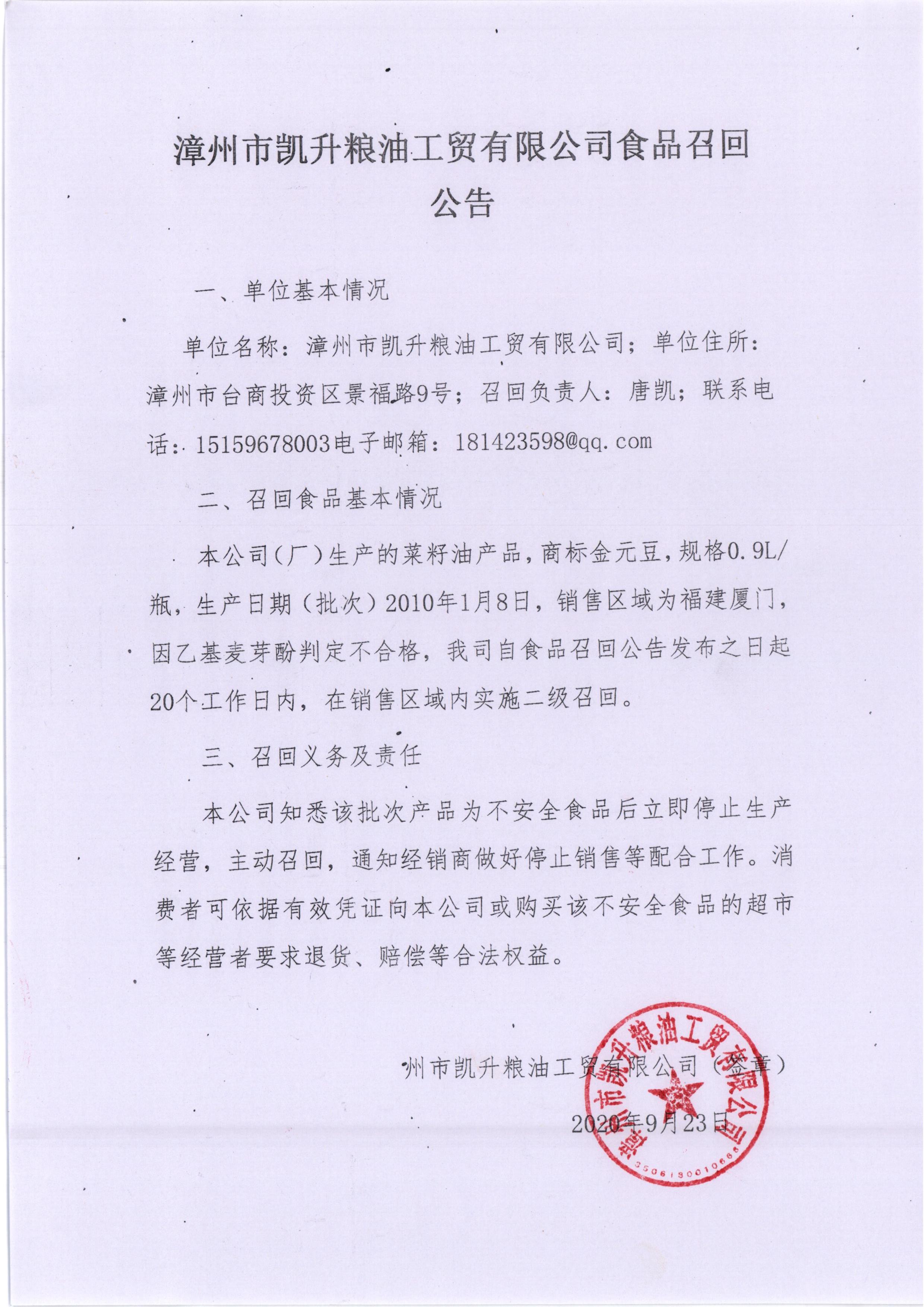 漳州市凱升糧油工貿(mào)有限公司食品召回公告(20200923)