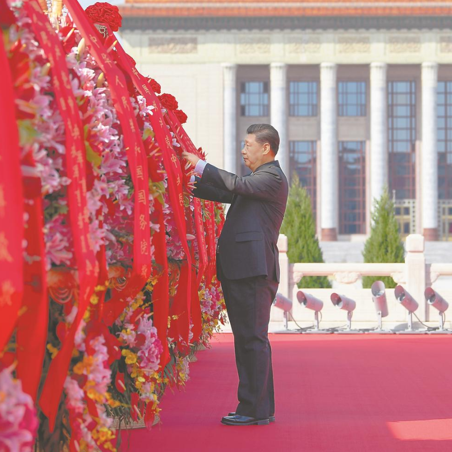 ?9月30日上午,黨和國家領(lǐng)導(dǎo)人習(xí)近平、李克強(qiáng)、栗戰(zhàn)書、汪洋、王滬寧、趙樂際、韓正、王岐山等來到北京天安門廣場,出席烈士紀(jì)念日向人民英雄敬獻(xiàn)花籃儀式。這是習(xí)近平整理花籃上的緞帶。 新華社記者 申宏 攝