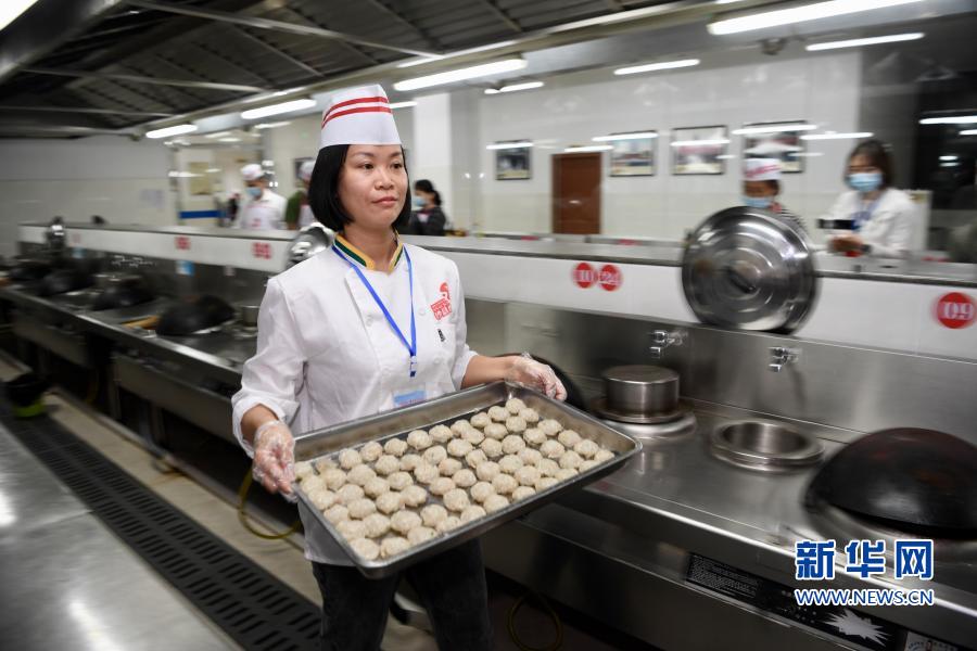 11月23日,在沙縣小吃培訓(xùn)中心,一名培訓(xùn)老師端著學(xué)員制作的沙縣小吃——水晶燒麥。新華社記者 姜克紅 攝