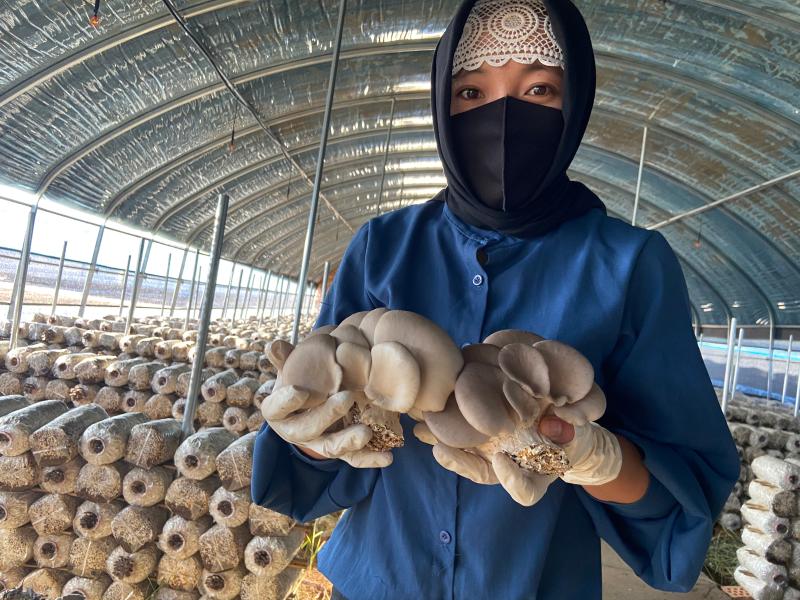 圖為在寧夏同心縣閩寧示范村中,當(dāng)?shù)剞r(nóng)民在閩寧協(xié)作的菇棚里工作,并展示種植成果。寧夏南安村是一個(gè)生態(tài)移民村,也是閩寧協(xié)作示范村之一。近年來,按照“政府引導(dǎo)、村兩委為主體、群眾參與”的發(fā)展思路,和“公司+基地+村集體+農(nóng)戶”生產(chǎn)模式,南安村食用菌產(chǎn)業(yè)實(shí)現(xiàn)了企業(yè)、村級(jí)集體經(jīng)濟(jì)和農(nóng)戶的多贏。東南網(wǎng)記者 顏財(cái)斌 攝