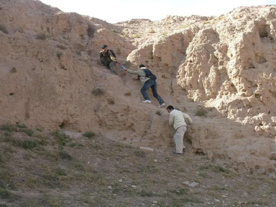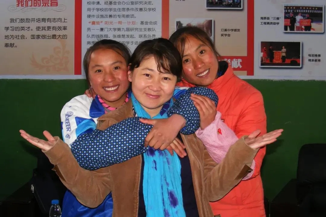 首屆研支團成員張秀麗再次回到海原縣時與當(dāng)年受助學(xué)生合影 沒有公路,第七屆研支團成員葉楠與其他成員手腳并用跨越一道又一道山峁去學(xué)生家中家訪。