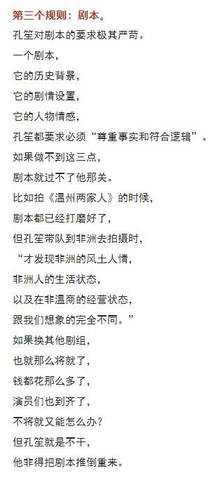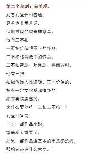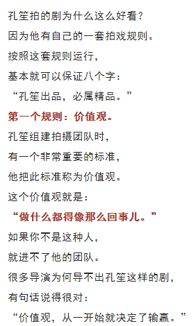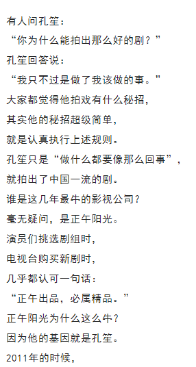 孔笙帶著幾名弟子離開山東影視集團(tuán), 然后創(chuàng)辦了東陽正午陽光影視公司。 在正午陽光這個(gè)團(tuán)隊(duì)里, 大家也都認(rèn)可一句話: “制片人候鴻亮是事務(wù)性領(lǐng)袖, 而導(dǎo)演孔笙是精神領(lǐng)袖?!?/span> 正午陽光能拍出那么多好劇, 就是因?yàn)樗麄儭白鍪裁炊枷衲敲椿厥隆薄?/span> 他們沒有什么大秘招, 他們的秘招就是“做了我們?cè)撟龅氖隆薄?/span> 10 我這次寫孔笙這個(gè)人物, 既沒有寫他的性格, 也沒有寫他的生活, 甚至放棄了寫他的成長和經(jīng)歷, 只是寫了他拍戲的態(tài)度。 我為何要選擇這個(gè)寫作角度呢? 因?yàn)槲矣X得現(xiàn)在中國影視行業(yè), 最欠缺的東西就是這個(gè)。 大家都想著怎么才能賺快錢, 而愿意腳踏實(shí)地做事的人實(shí)在是太少了。 但孔笙的成功、正午陽光的成功, 恰好證明了一個(gè)道理: 這世上并沒有什么捷徑, 最快的捷徑就是腳踏實(shí)地做事情。 貝弗利·希爾斯說得好: “這世上任何值得去的地方,都沒有捷徑?!?/span>
