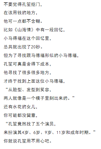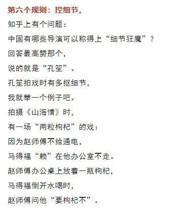 這場戲最初的版本是: 趙師傅主動(dòng)問馬得福: “要枸杞不? 不要放太多,兩三粒就行。” 馬得福要了。 孔笙覺得不太合理, 于是有了第二個(gè)版本: 得福主動(dòng)問趙師傅: “有枸杞不?我也泡倆?!?/span> 孔笙還是覺得不太合理, 于是想了第三個(gè)版本: 趙師傅問:“你要枸杞不?” 得?;卮穑骸安灰疑眢w好著呢?!?/span> 最終播出時(shí), 我們看到的是第三個(gè)版本。 這個(gè)版本確實(shí)最符合劇情, 因?yàn)榈酶E芰撕脦滋硕家姴怀桑?/span> 心里那是有氣的, “我身體好著呢”這句話, 配合他臉上不悅的表情, 正好表達(dá)了他的不滿情緒。 孔笙這細(xì)節(jié)摳得, 只能用一個(gè)字形容——牛! 09