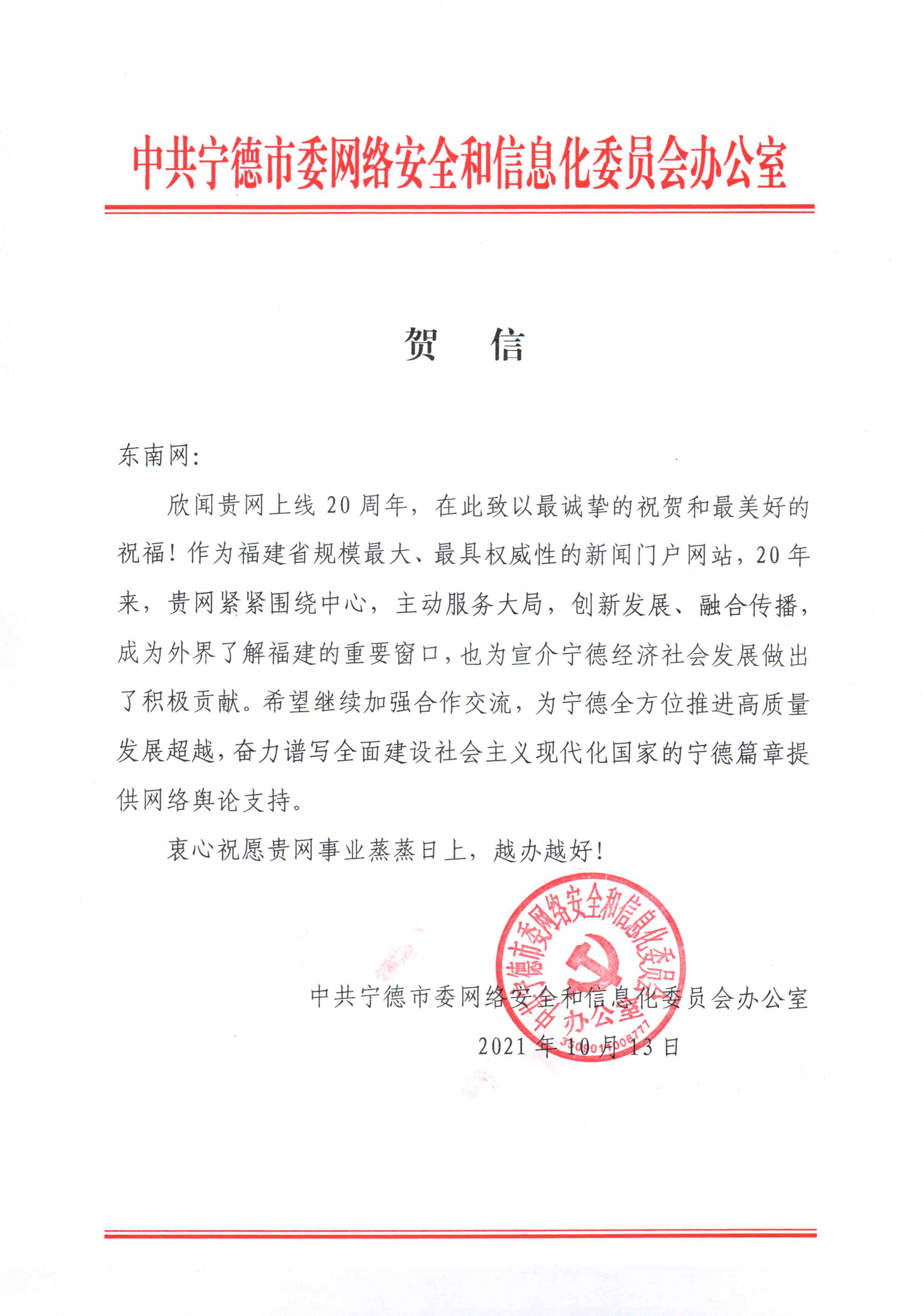中共寧德市委網(wǎng)絡(luò)安全和信息化委員會(huì)辦公室賀信