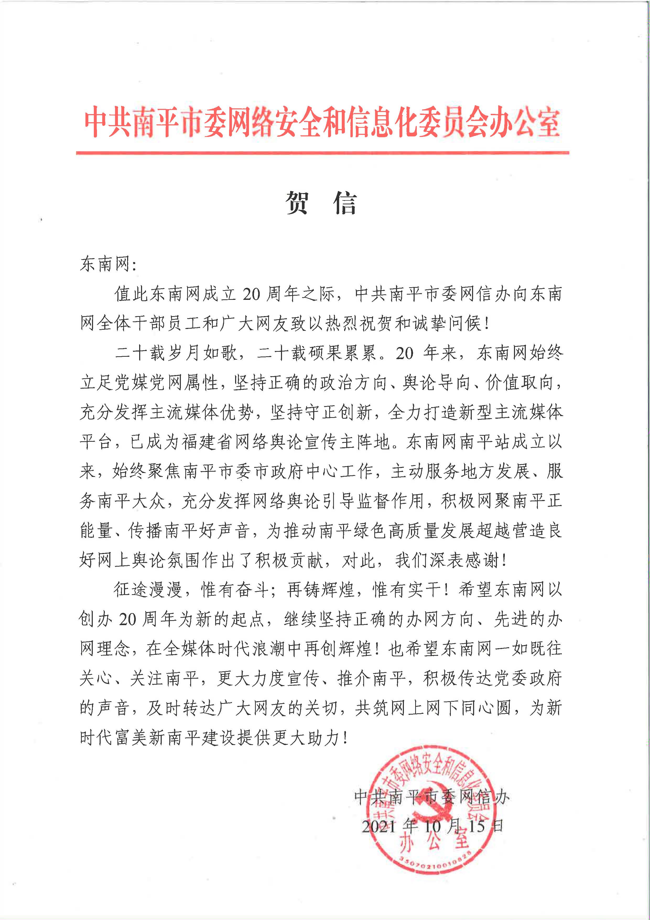中共南平市委網(wǎng)絡(luò)安全和信息化委員會(huì)辦公室賀信