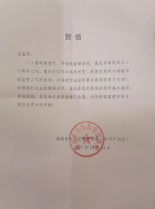 福建省市場(chǎng)監(jiān)督管理局(知識(shí)產(chǎn)權(quán)局)賀信