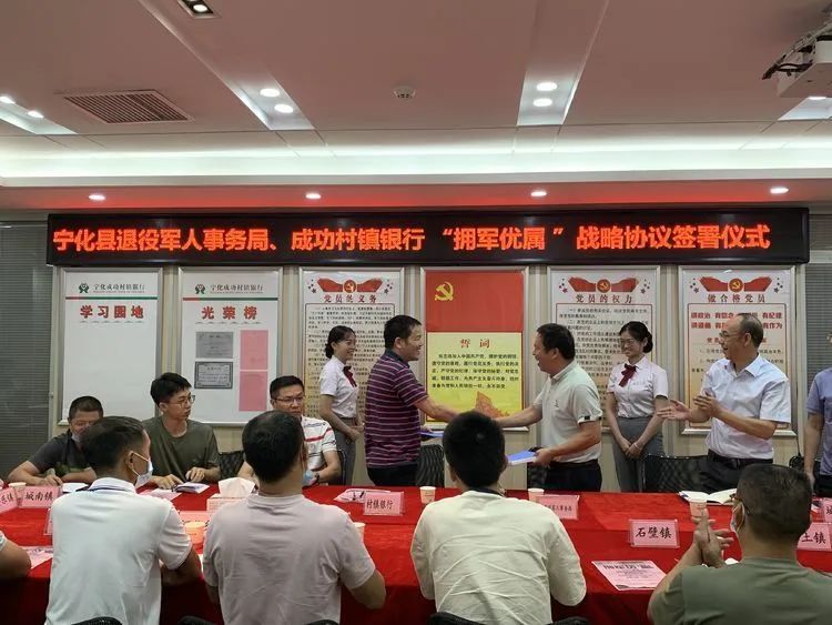 9月16日,寧化縣退役軍人事務(wù)局與成功村鎮(zhèn)銀行簽署擁軍優(yōu)屬戰(zhàn)略合作協(xié)議,共同探索新時(shí)代社會(huì)化擁軍優(yōu)撫工作的新模式、新路子,為廣大退役軍人及優(yōu)撫對(duì)象提供更好的優(yōu)待服務(wù)。寧化縣退役軍人事務(wù)局局長(zhǎng)范鵬舉、成功村鎮(zhèn)銀行董事長(zhǎng)馬先輝、各鄉(xiāng)(鎮(zhèn))退役軍人服務(wù)站負(fù)責(zé)人等出席儀式。