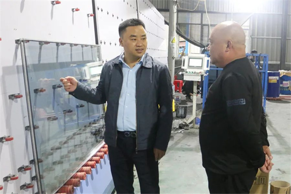陳學(xué)林(左一)向劉宗銀了解鋼化玻璃生產(chǎn)情況。尤溪縣融媒體中心供圖 2020年,退役軍人劉宗銀看中西城鎮(zhèn)交通區(qū)位優(yōu)勢(shì),想在當(dāng)?shù)匦陆ㄤ摶锌詹Aa(chǎn)線項(xiàng)目,但遇到了園區(qū)道路、變壓器增容等方面的問題。陳學(xué)林得知后,立即組建專班,靠前服務(wù),溝通自然資源、供電、工信、發(fā)改、公路等部門,通過現(xiàn)場(chǎng)辦公等方式,以“軍人速度”快速推動(dòng)項(xiàng)目建設(shè)。據(jù)了解,這個(gè)項(xiàng)目實(shí)現(xiàn)了當(dāng)年度引進(jìn)、開工、投產(chǎn)、上規(guī),次年實(shí)現(xiàn)產(chǎn)值4000多萬元。