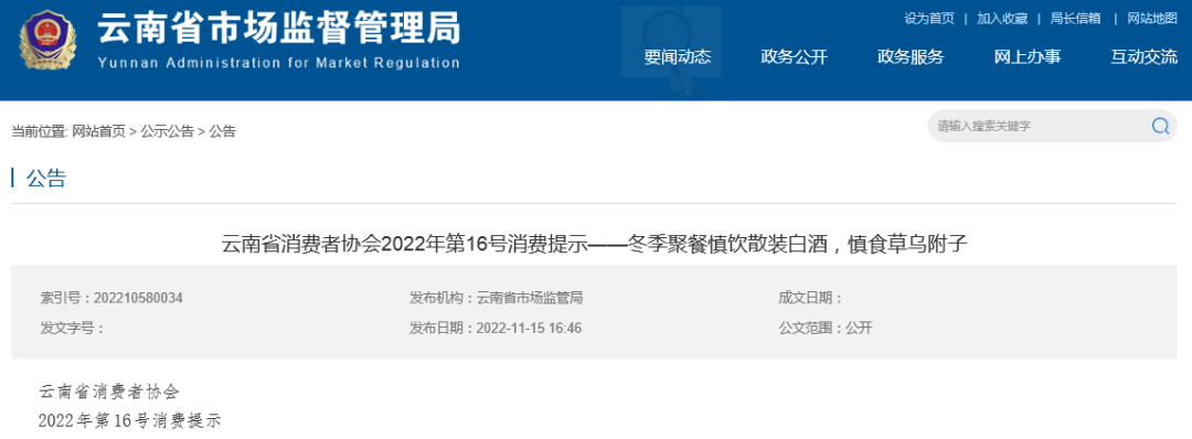 冬季聚餐慎飲散裝白酒,慎食草烏附子 一、消費者要樹立“自己是健康第一責任人”的健康理念,加強食品安全意識,正確選購和飲用白酒。01:選購正規(guī)廠家生產的散裝白酒,購買時查看標簽內容是否齊全,對明顯低于市場價格的散裝白酒要保持高度警惕,不采購、不飲用生產廠家不明、未經登記備案的小作坊生產加工的散裝白酒,不要購買、飲用私自勾兌和來源不明的散裝白酒;02:家庭自釀白酒嚴禁對外出售,不要在集體用餐中提供家庭自釀酒;03:農村集體聚餐主辦者嚴禁采購無合格檢測報告、生產廠家不明、未經登記備案的白酒小作坊生產加工的散裝白酒及自釀酒用于集體聚餐飲用;04:白酒生產經營者嚴禁購買、貯存和使用甲醇、工業(yè)酒精等非食品原料。使用醇基液體燃料的各類餐飲服務單位,要加強使用環(huán)節(jié)管理,專人專位管理存放,標貼明顯標識,做好領用登記,嚴禁同白酒混合存放。 二、草烏、附子不是食品!請廣大消費者慎食草烏、附子等毒性中藥材,避免中毒。01:正確認識草烏、附子等毒性中藥材,在無醫(yī)生指導的情況下不要擅自服食,做到不參與、不邀約、不聚眾食用草烏、附子;02:經營者應嚴格遵守《中華人民共和國食品安全法》《醫(yī)療用毒性藥品管理辦法》,不以任何方式經營以草烏、附子等毒性中藥材為原料的食品(包括自制泡酒)。 |