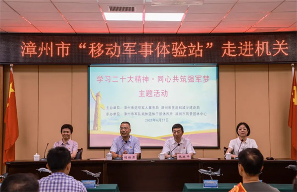 “學(xué)習(xí)二十大精神,同心共筑強軍夢”。6月27日,漳州市“移動軍事體驗站”首次走進漳州市風(fēng)景園林中心,面向機關(guān)干部職工開展國防教育。以此紀念延安雙擁運動80周年,推動全民國防教育走深走實。漳州市住建局、漳州市風(fēng)景園林中心50余人參加活動,漳州市退役軍人事務(wù)局黨組成員、副局長楊裕勇致詞。 活動前,軍休科技志愿服務(wù)隊員陳瑞梅結(jié)合近期國防形勢,為干部職工開展《守衛(wèi)祖國空域》國防教育課。陳瑞梅從殲-20、轟6K、空警500三種機型的性能特點、空域作戰(zhàn)能力、未來戰(zhàn)爭組合拳出發(fā),圖文并茂式向干部職工介紹了我軍近年來軍事武器裝備的發(fā)展歷程。